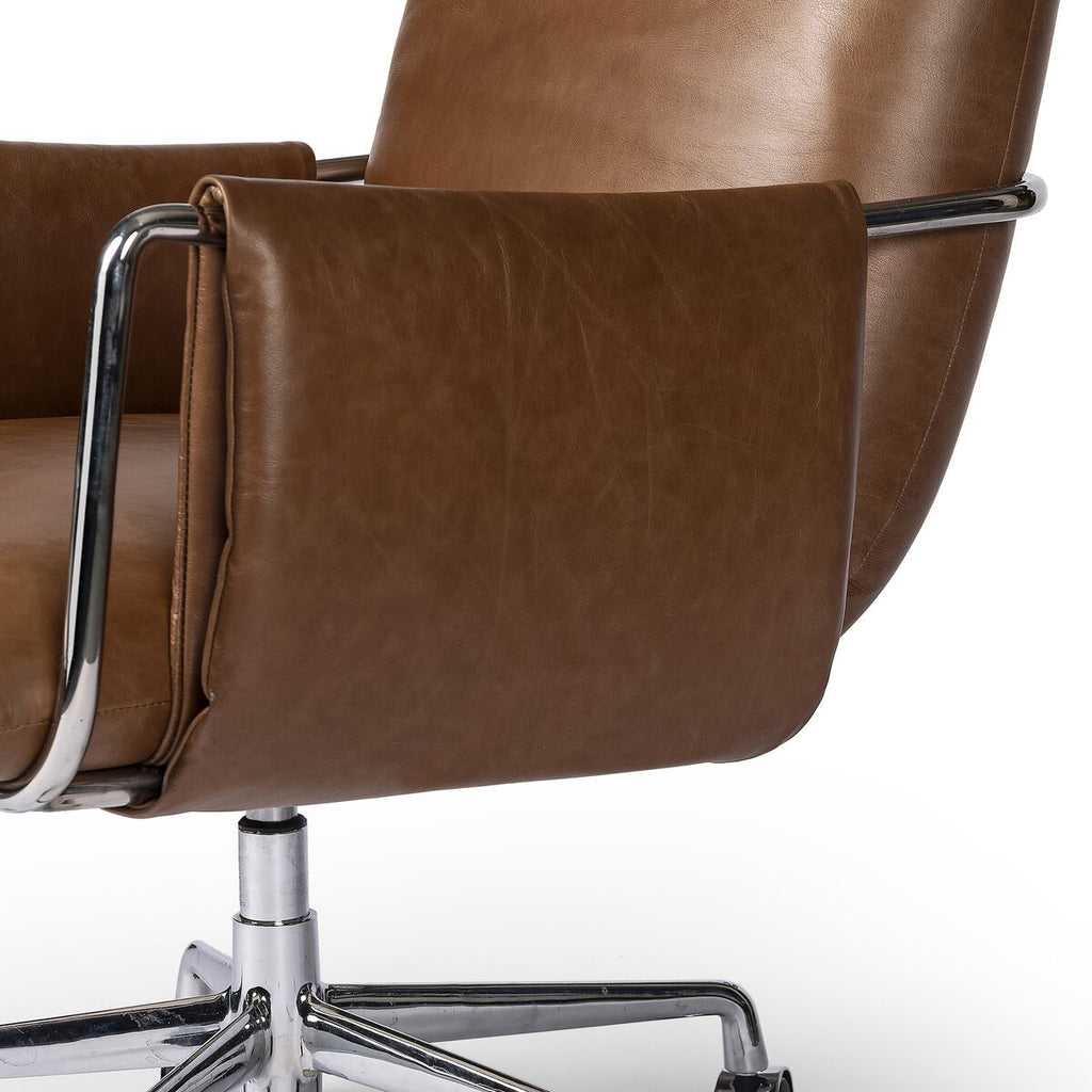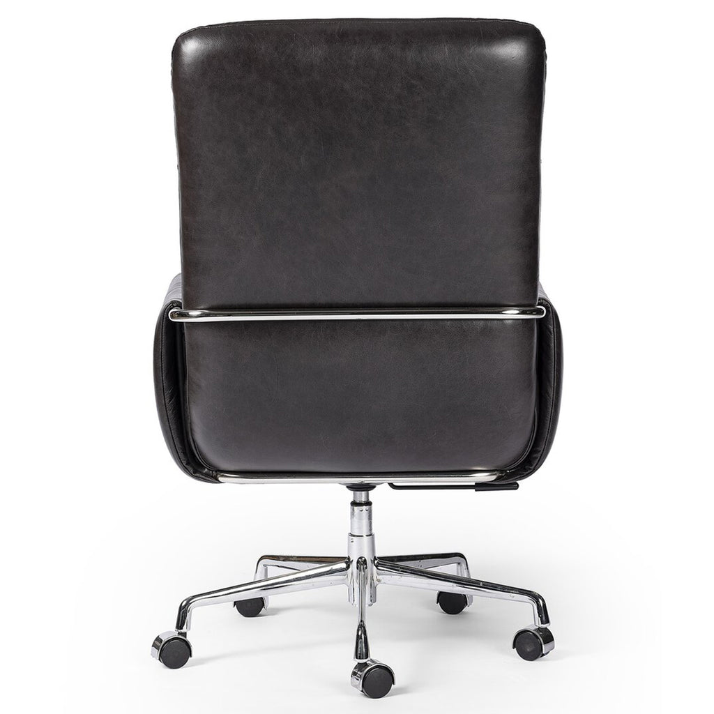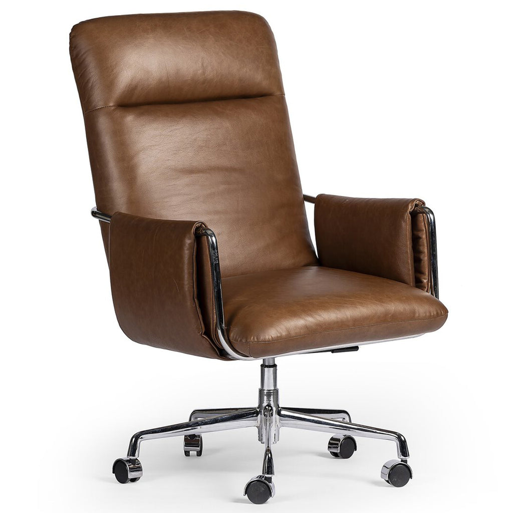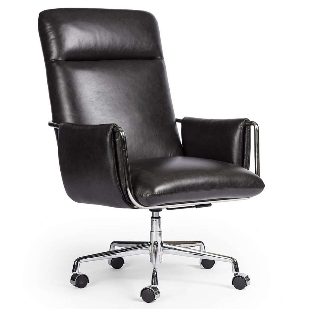 Shiny stainless steel frames top-leather cushioning for a balance of comfort and edge. Overfilled for a relaxed sit, the cushioned seat and back keep things supportive. Adjustable height and smooth 360-swivel bring ease to your workspace.