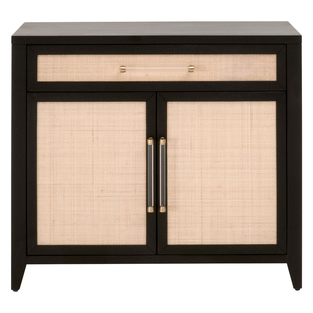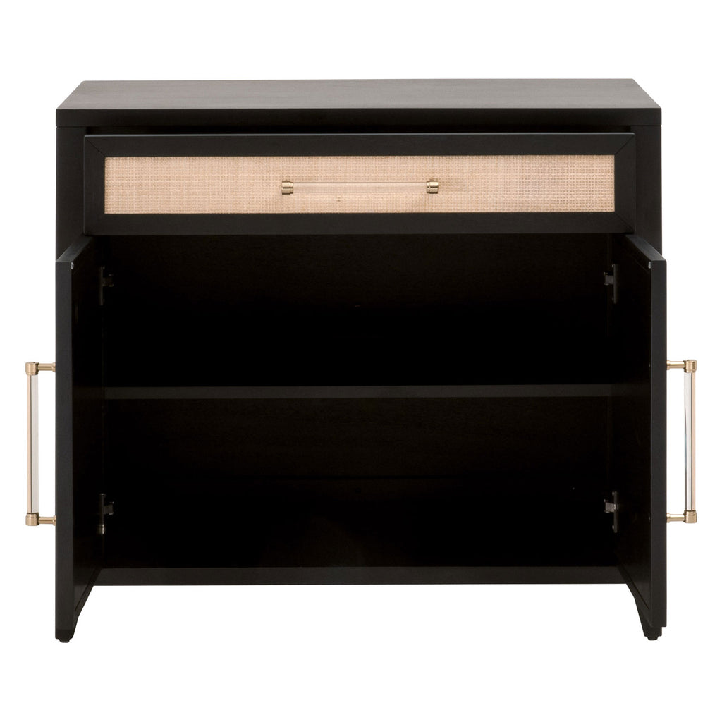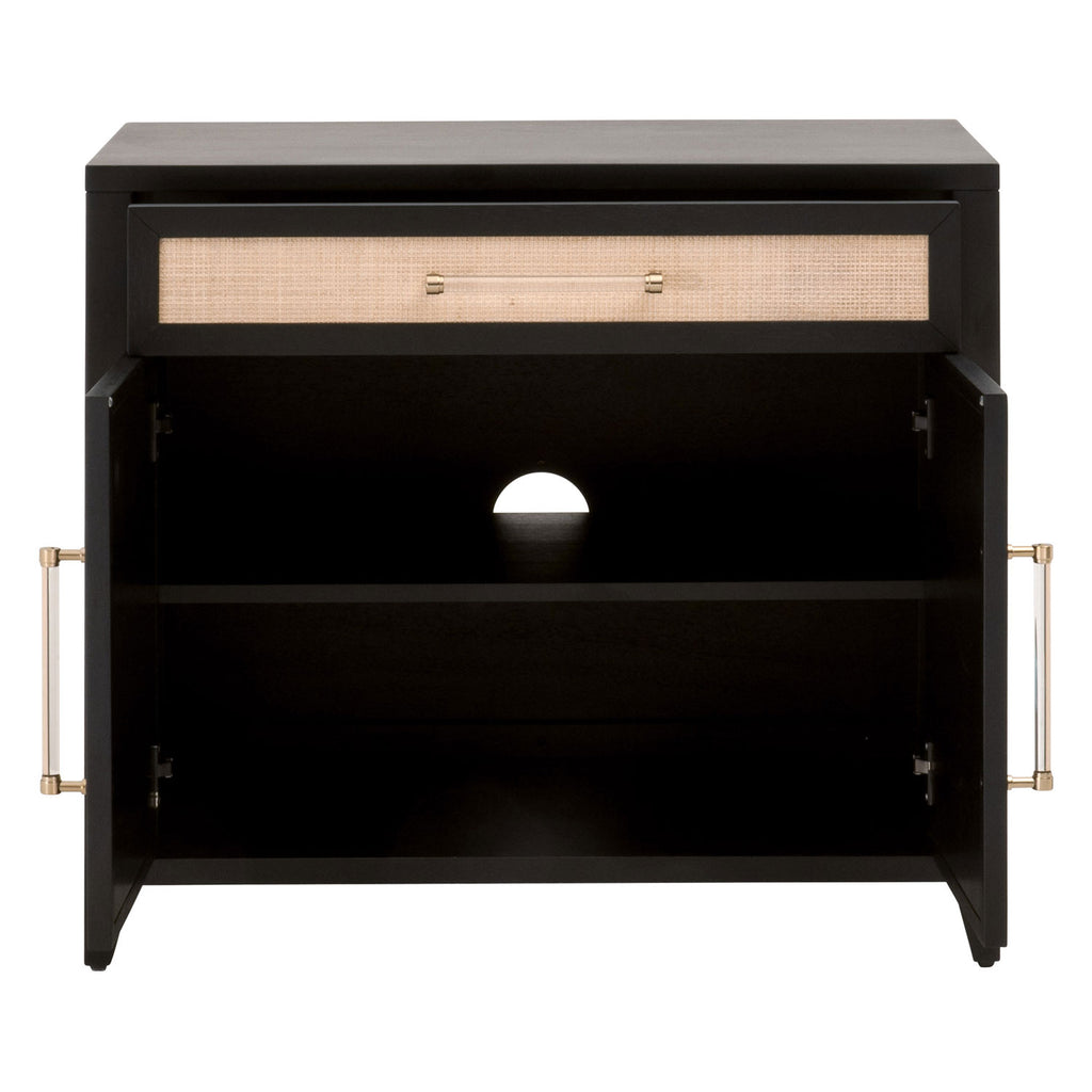 The transitional Essentials for Living Holland media chest nicely blends design styles taken from tropical, traditional, and modern looks. The front drawer and doors feature a natural rattan inlay framed by a brushed black or matte white acacia wood. This bold and natural look will be a long-lasting statement piece for years to come. The interior cabinet conveniently features a cord management hole for electronic devices and an adjustable shelf to reach your desired height. The modern-looking clear handles with brushed brass ends uniquely accessorize this media cabinet as well. This versatile piece is more compact than most media sideboards and entertainment centers, making it an ideal fit for smaller spaces. Tradition Collection's Natural Rattan finish is a natural material that includes unavoidable variation in color, texture, blemishes and marks. These features are not defects, but rather the material's natural characteristics.