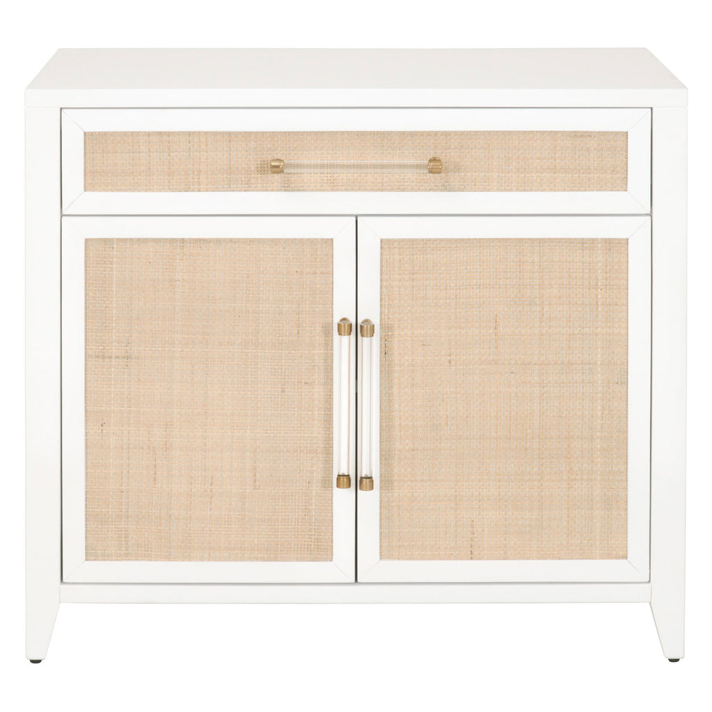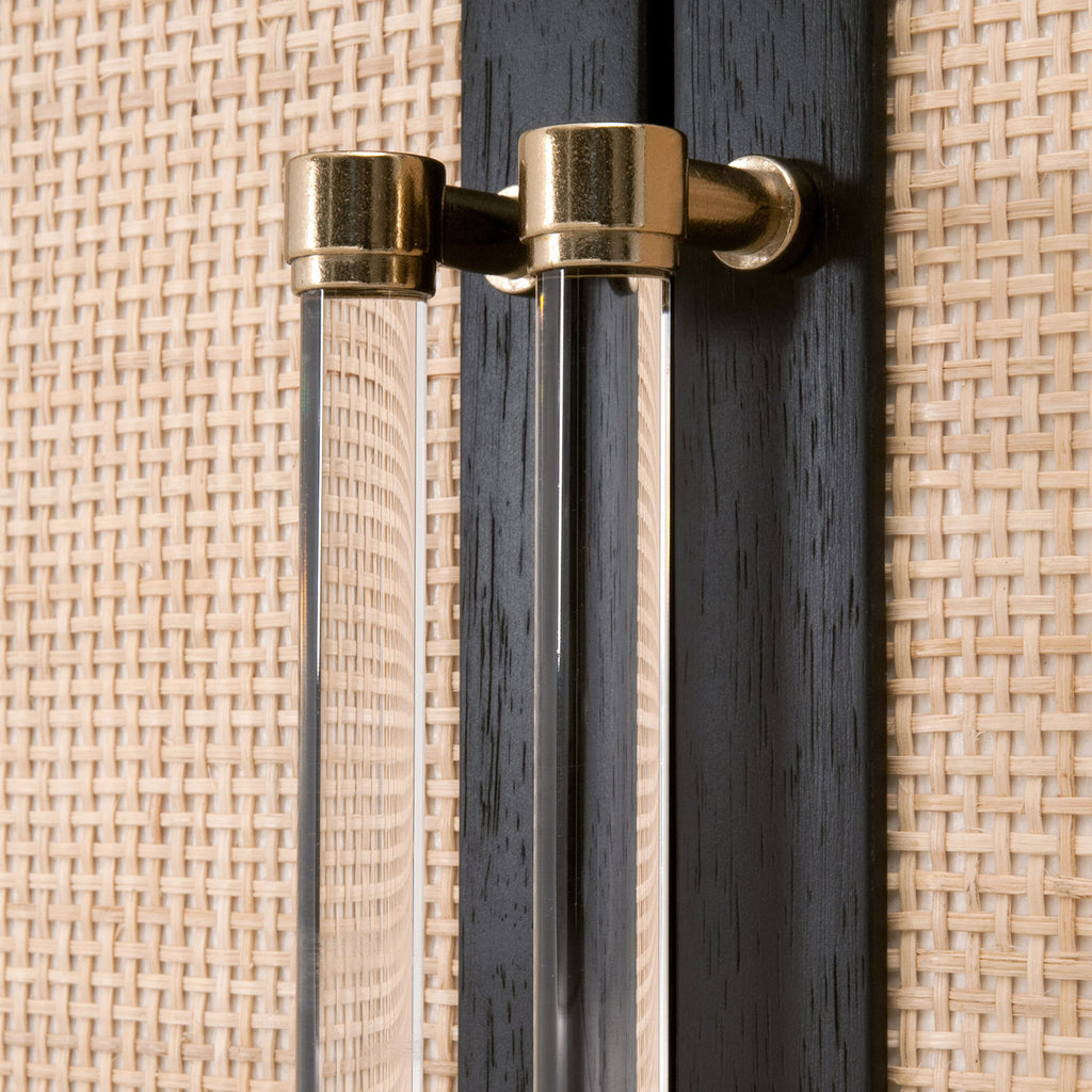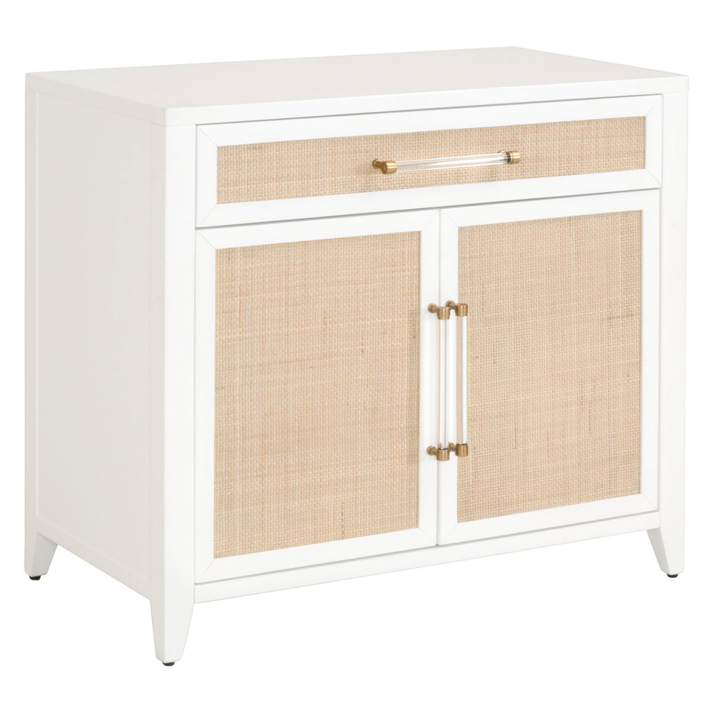 The transitional Essentials for Living Holland media chest nicely blends design styles taken from tropical, traditional, and modern looks. The front drawer and doors feature a natural rattan inlay framed by a brushed black or matte white acacia wood. This bold and natural look will be a long-lasting statement piece for years to come. The interior cabinet conveniently features a cord management hole for electronic devices and an adjustable shelf to reach your desired height. The modern-looking clear handles with brushed brass ends uniquely accessorize this media cabinet as well. This versatile piece is more compact than most media sideboards and entertainment centers, making it an ideal fit for smaller spaces. Tradition Collection's Natural Rattan finish is a natural material that includes unavoidable variation in color, texture, blemishes and marks. These features are not defects, but rather the material's natural characteristics.