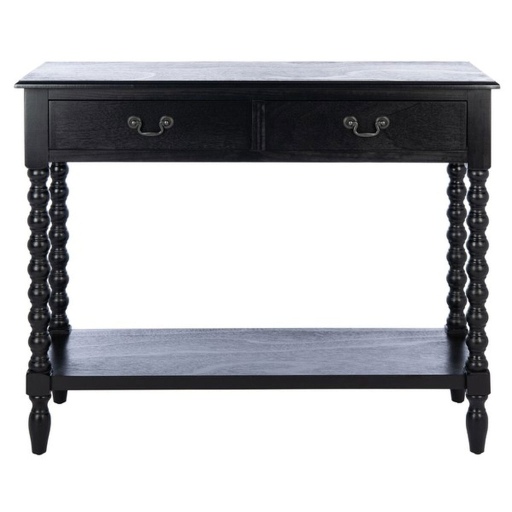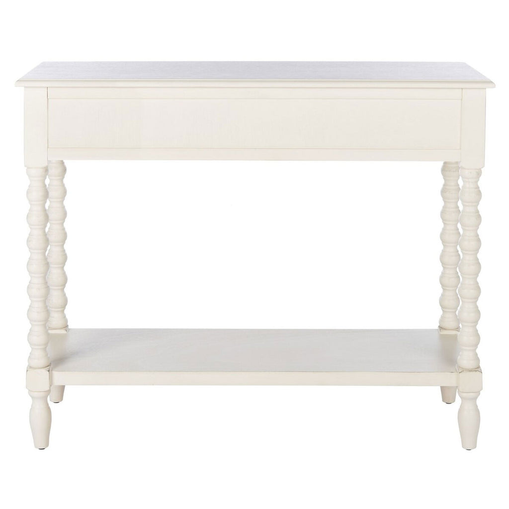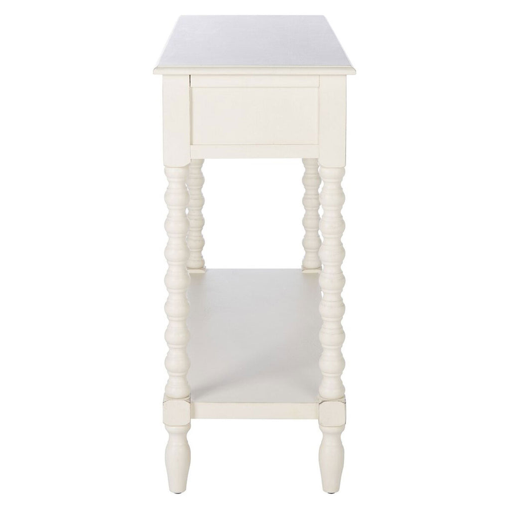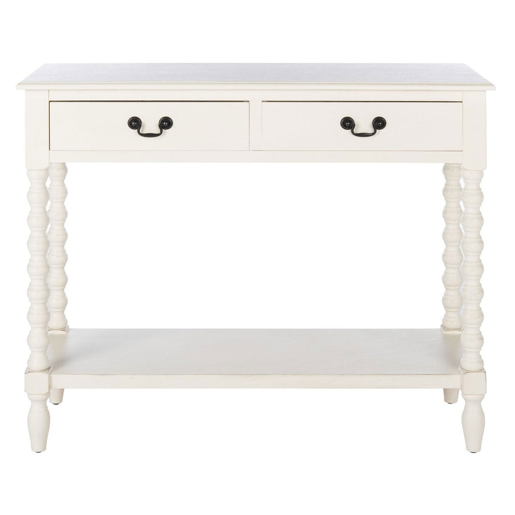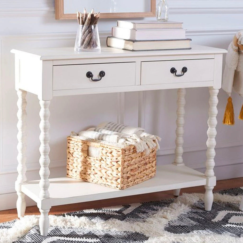 Bring farmhouse charm to any classic contemporary décor with this console table. The modernized ball turned legs are beautifully highlighted by its distressed white finish, while an open bottom shelf and twin slim drawers provide ample storage and display space.