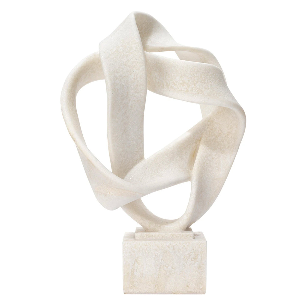 The Jamie Young Intertwined organic shaped object is placed on a museum worthy stand to elevate its curves and unique silhouette. It's white resin form adds visual interest to any exposed etagere shelf or behind glass in a curio cabinet with your favorite collected objects.