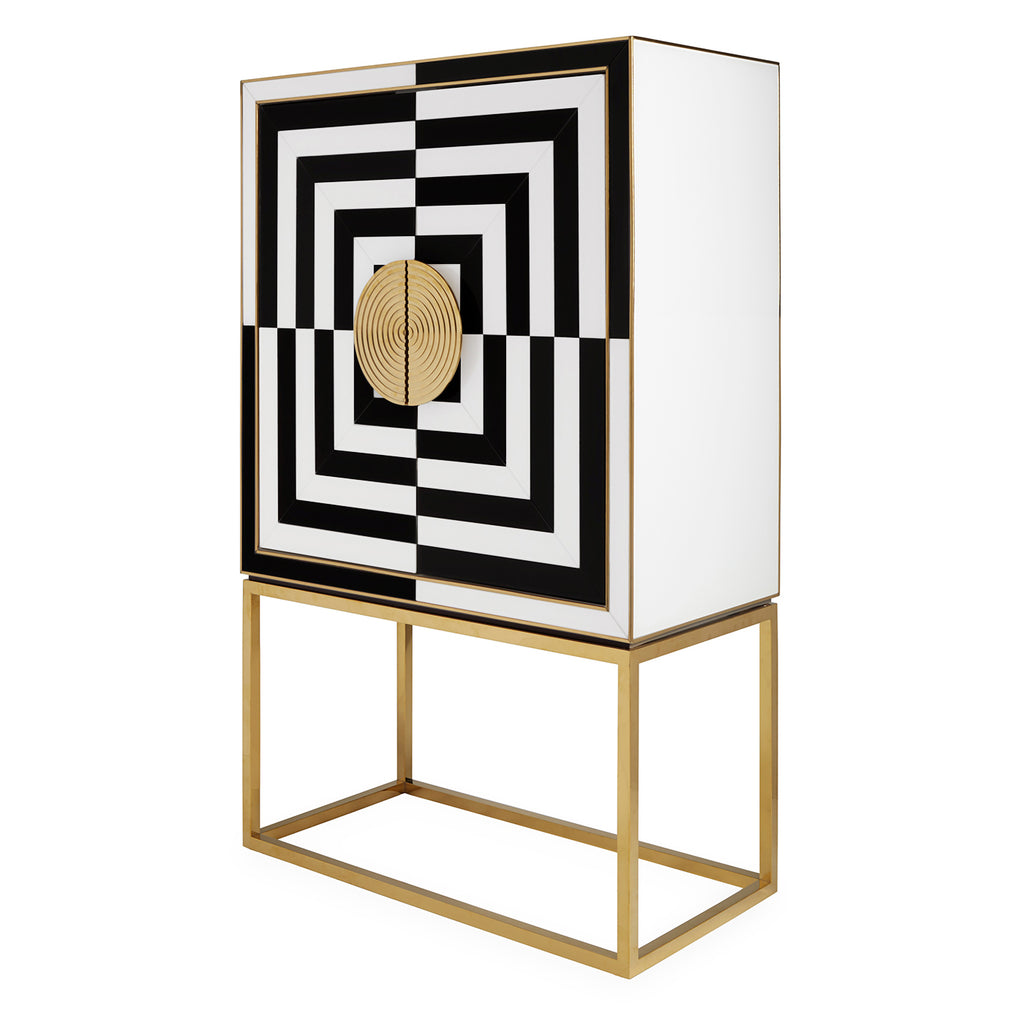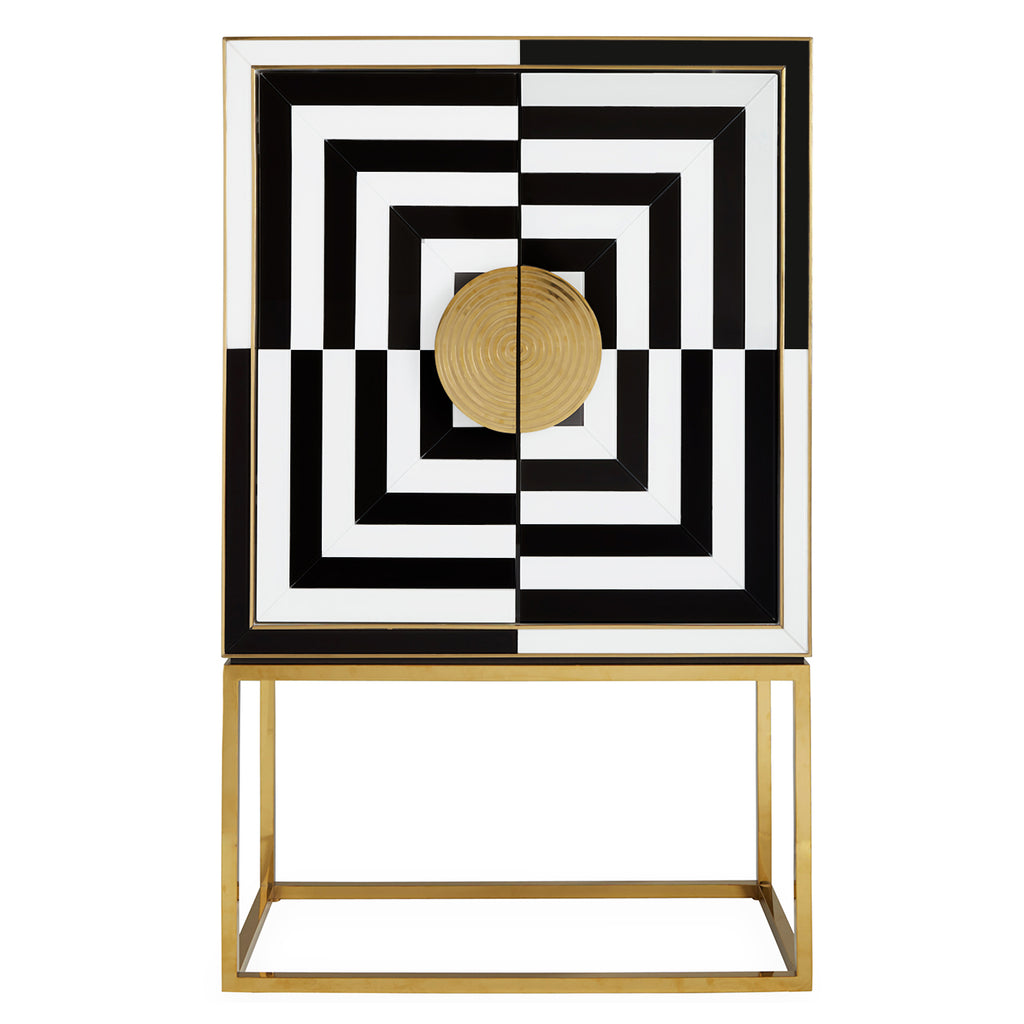 A limited-quantity edition, the Jonathan Adler modernist and mind-bending cabinet features glass panes reverse-painted in charcoal and ivory with polished brass details. Grooved, split-circle door pulls add a glam spin. Fitted with adjustable tempered glass shelves, plus six wire-bound drinking glass shelves inside the doors. Two drawers at the base keep your mixing accoutrements at hand.