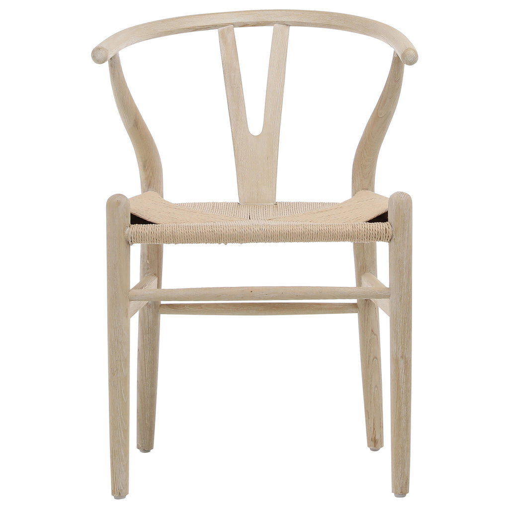 A trendy take on a classic mid-century modern favorite. This dining chair stands out with its curved oak wood frame. The woven, seagrass or craft paper seat adds an organic feel to the sculptural form and cutout back design. Certainly, a statement piece.
