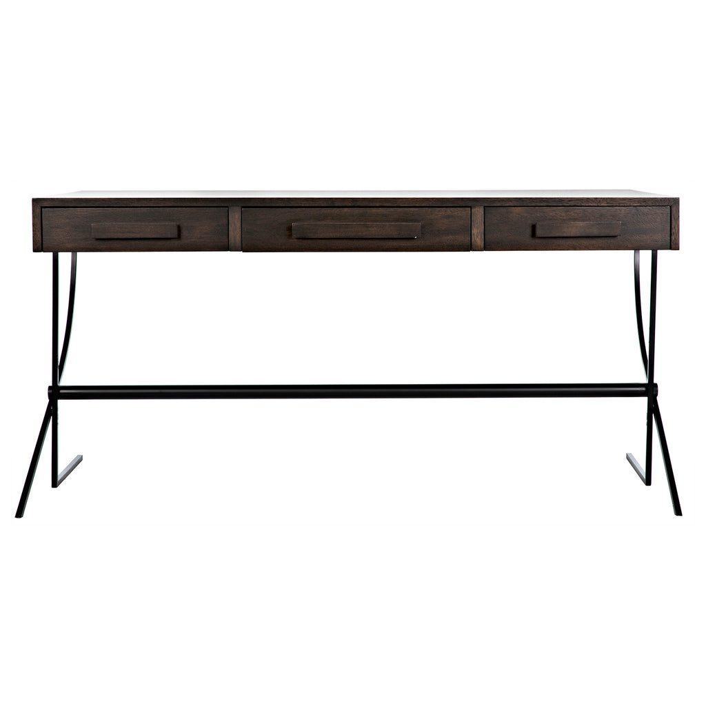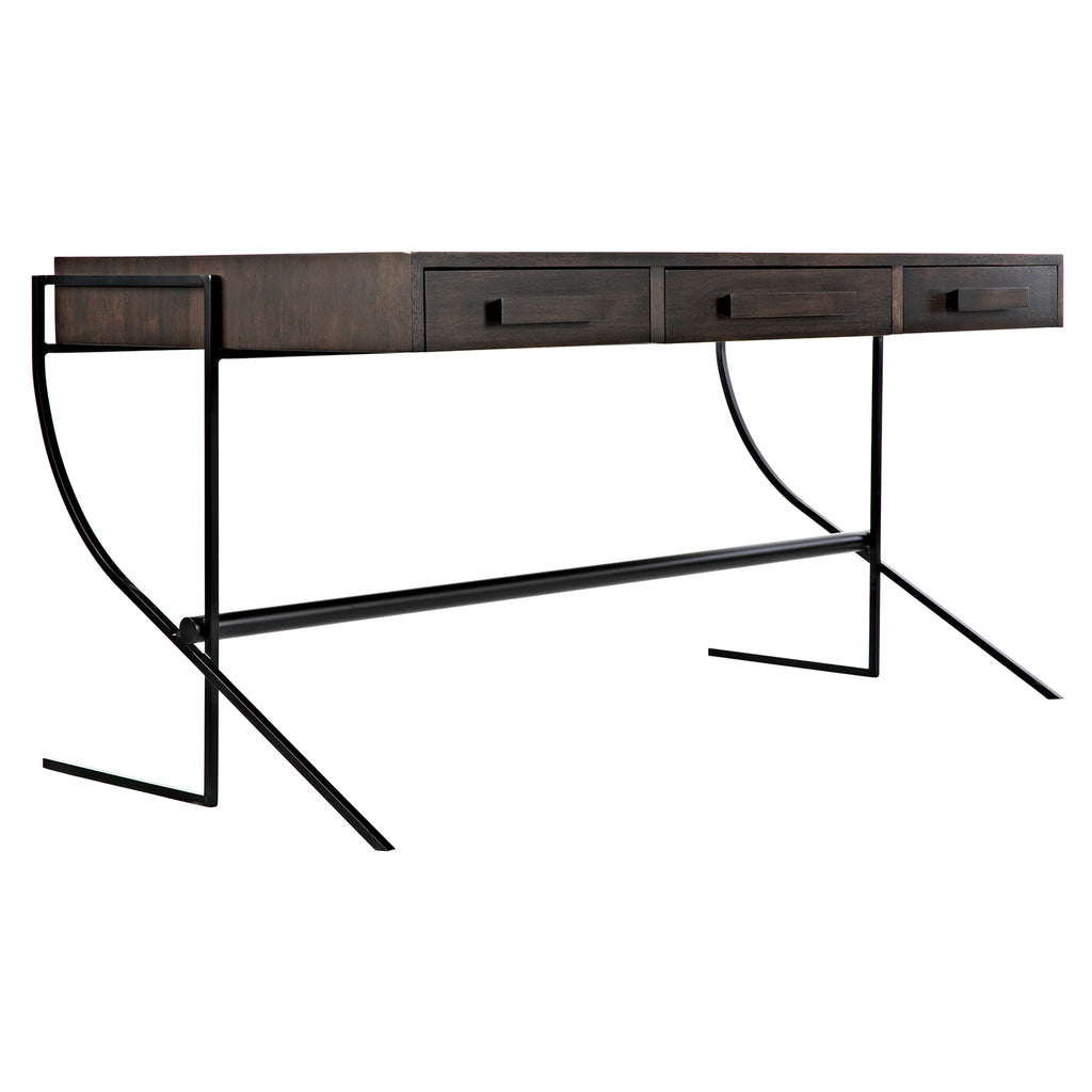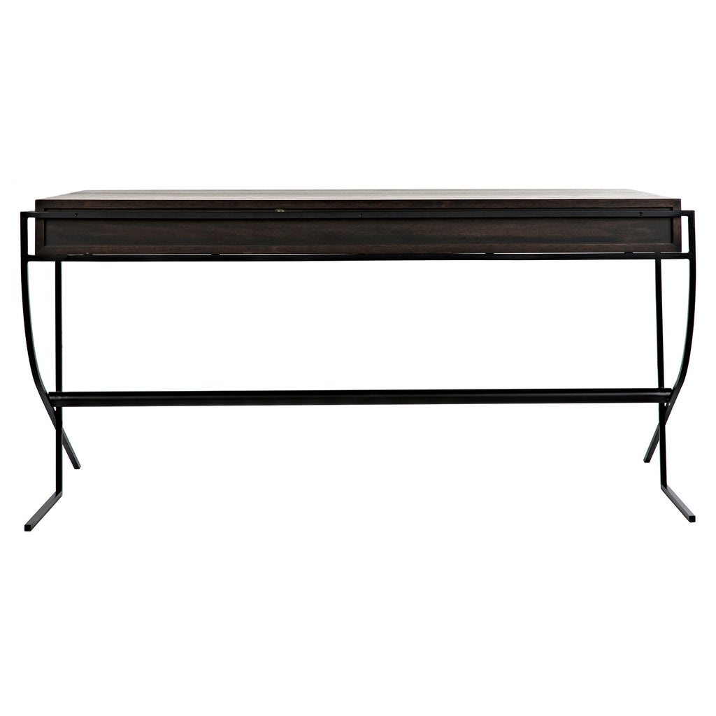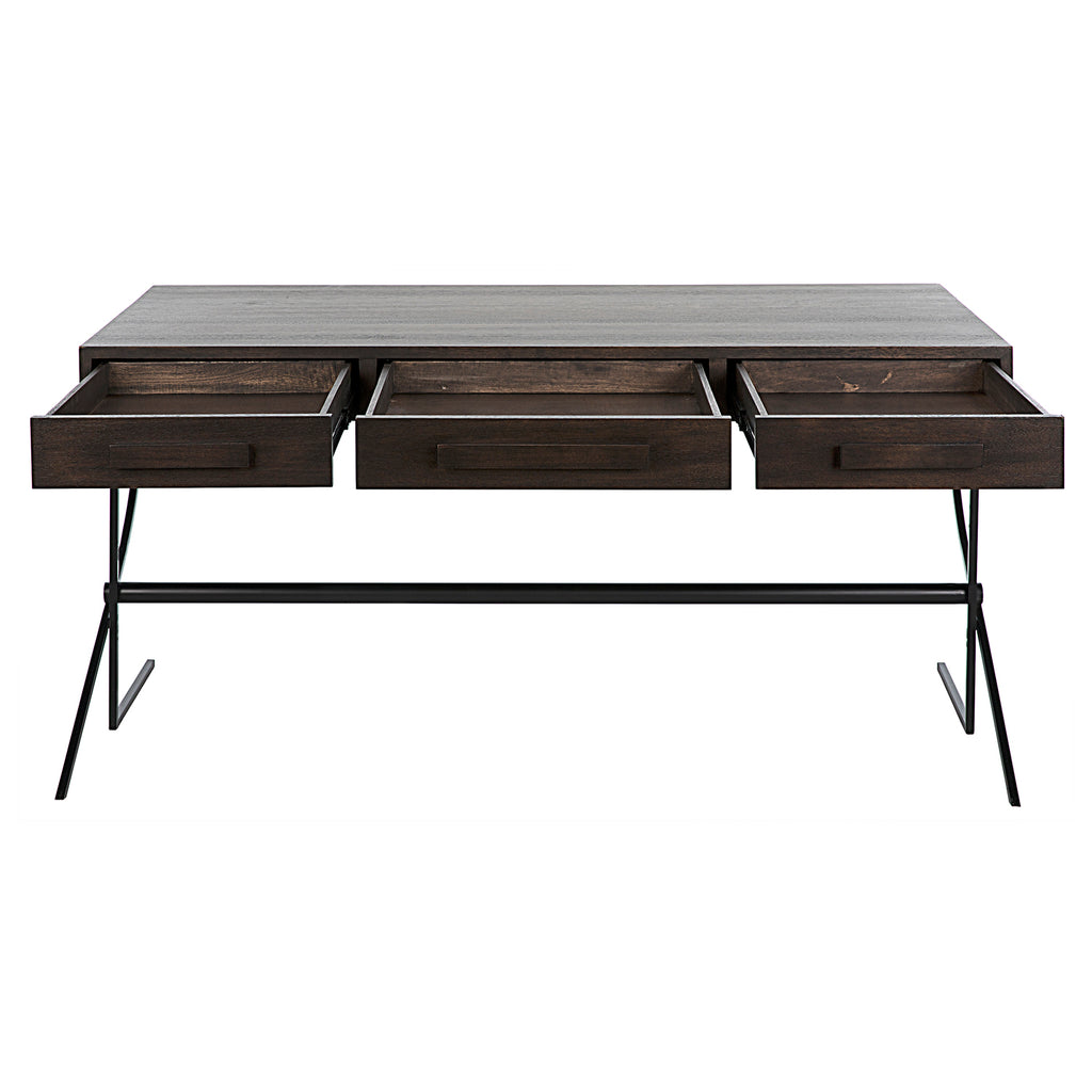 This classic writing desk is distinguished by its masterful craftsmanship. Its classic lines are enhanced with a dark walnut finish, and its four drawers open easily with metal pulls.
