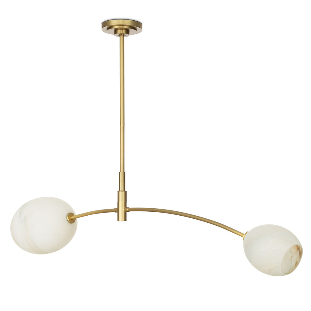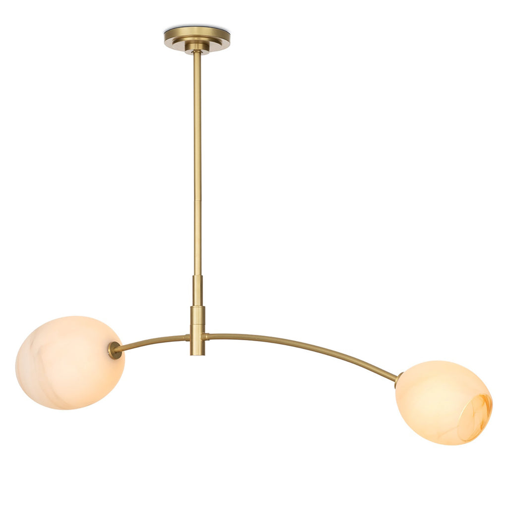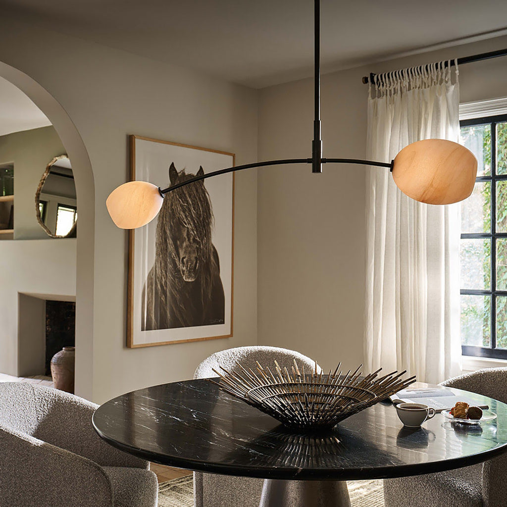 The Artemis Double Pendant masterfully balances simplicity with artisanal craftsmanship, featuring open-ended globes elegantly positioned at each end of its mobile-inspired, arched arm in multiple finish. This striking fixture exudes a modern vibe, making it a standout addition to any space.