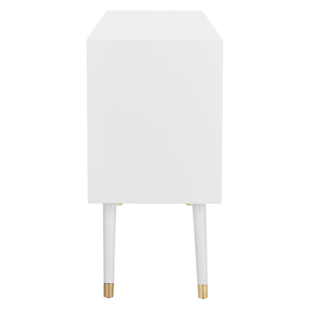 The mod style and character of this retro dresser updates any bedroom. Crafted with a wood veneer, its contemporary, sleek surface highlights the charming vintage-style brass hardware on its six drawers and chic capped legs.