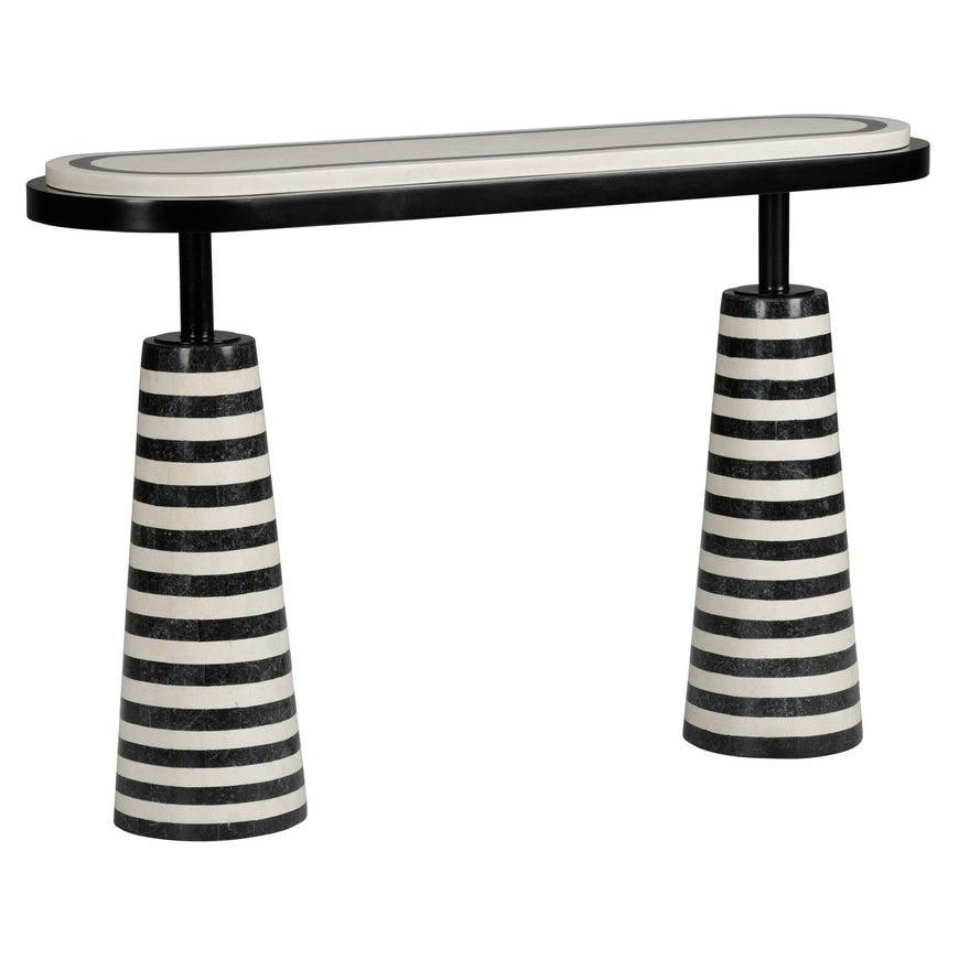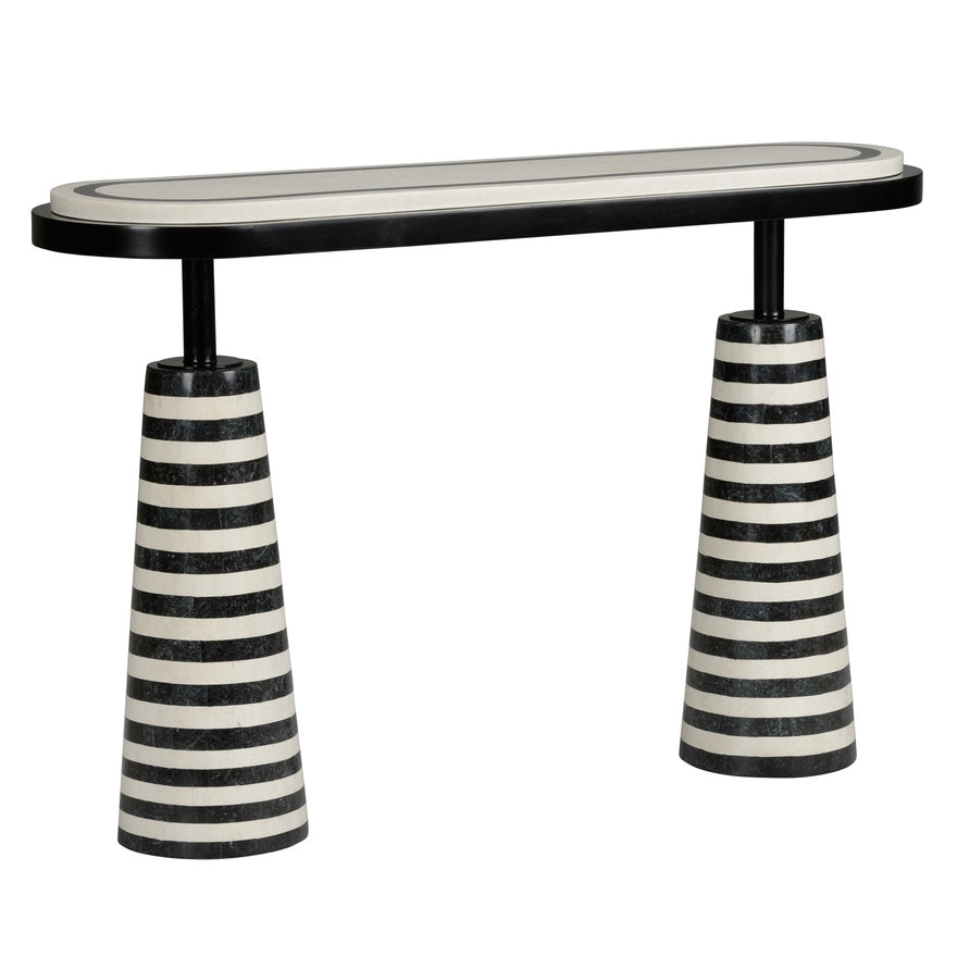 Memphis Milano Console is a playful, yet sophisticated design inspired by the avant-garde movement of the Memphis Group. Layers of natural black and white stone create style and provide stability in a modern setting.