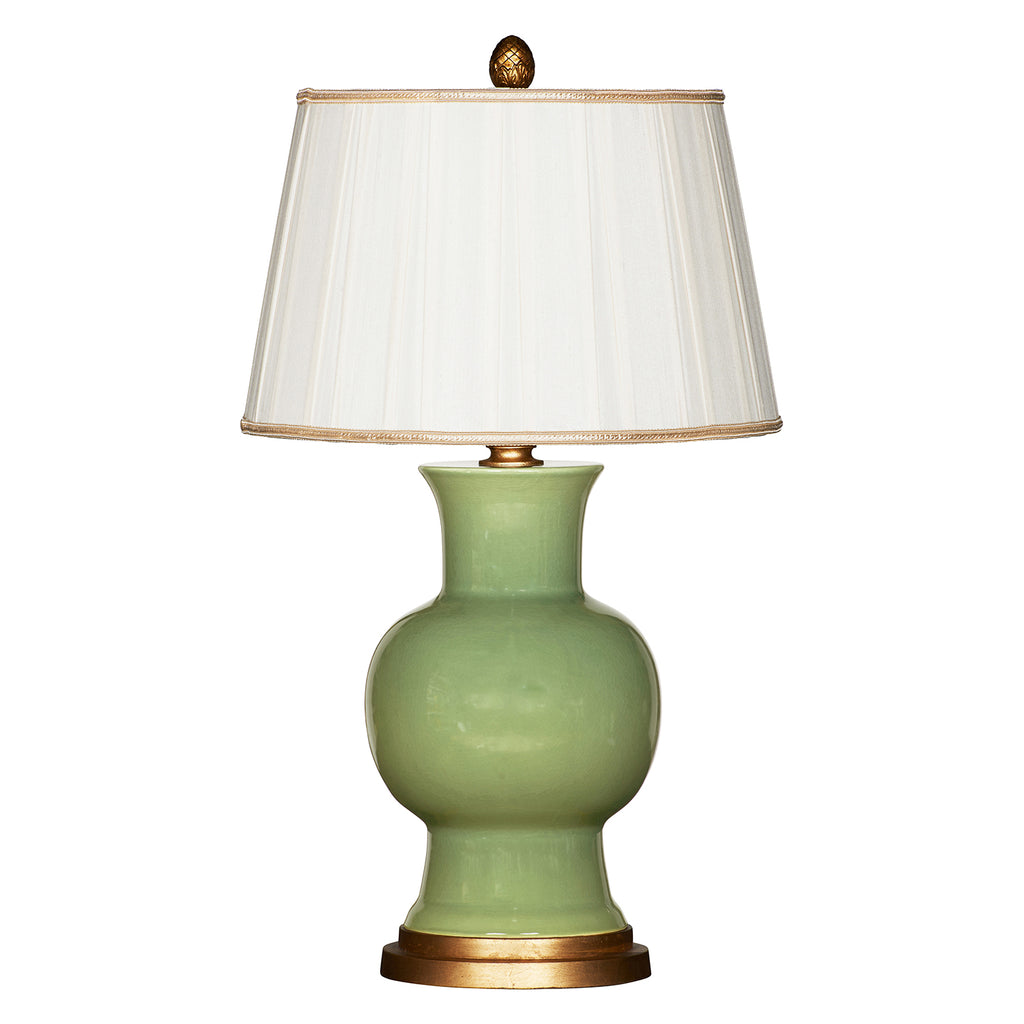 Bring a lovely and timeless upgrade to a living room or seating area with this ceramic green table lamp. The curvy silhouette serves as a base for a cream silk shade, adorned with gold trim on the top and bottom. The gold base and trim on the lamp shade perfectly complement the transitional gold ball finial.