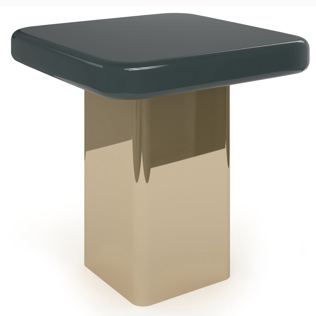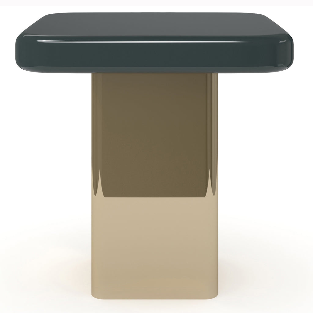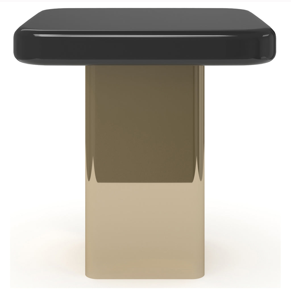 Add a pop of color to any room with this this square accent table that blends with contemporary or retro decor. Its top features rounded beveled edges and a high-gloss finish in Apatite Gloss or Chocolate Truffle finish with Whisper of Gold accents and bands. The square pillar base mimics the tops rounded edges but is finished in shimmering Whisper of Gold.