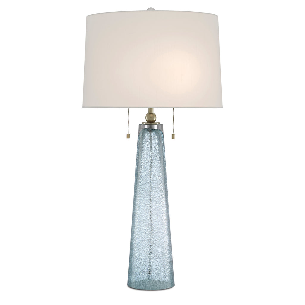 The bubbly surface of pale blue seeded glass is only one facet of the Currey & Co  Looke Table Lamp’s appeal. The fact that the material has been blown into a tall, slim column that telescopes downward is its most personable attribute. We treated the metal hardware and pull-chains to a brass finish and topped this slender beauty with an off-white shantung drum shade.