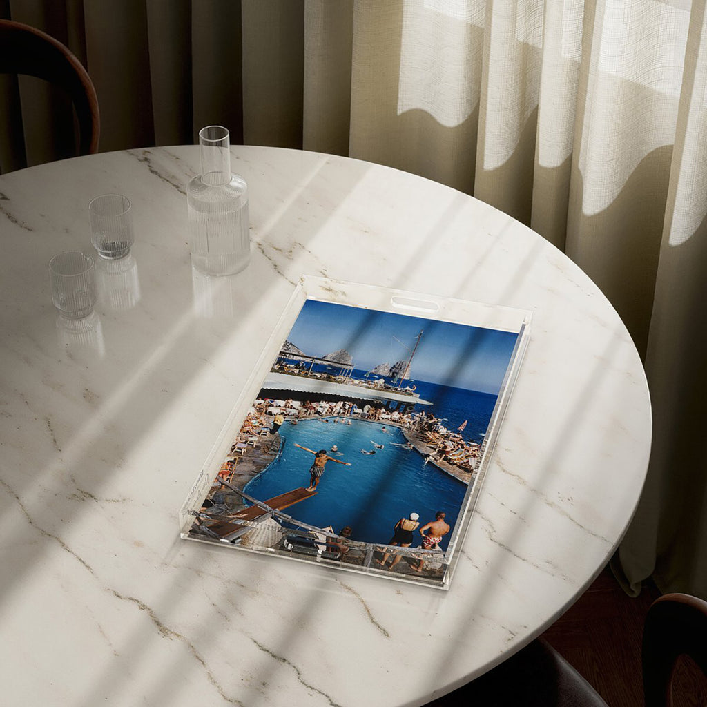 A specially selected work from the late influential photographer Slim Aarons, printed directly on an acrylic tray that's crafted in-house by Four Hands Art Studio. Handmade in Austin, Texas, each piece includes a certificate of authenticity commemorating the partnership between Slim Aarons, Getty Images Gallery and Four Hands Art Studio. Photo courtesy of Getty Images.