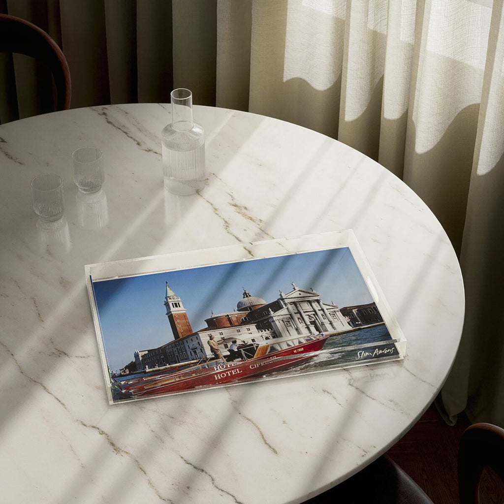 A specially selected work from the late influential photographer Slim Aarons, printed directly on an acrylic tray that's crafted in-house by Four Hands Art Studio. Handmade in Austin, Texas, each piece includes a certificate of authenticity commemorating the partnership between Slim Aarons, Getty Images Gallery and Four Hands Art Studio. Photo courtesy of Getty Images.