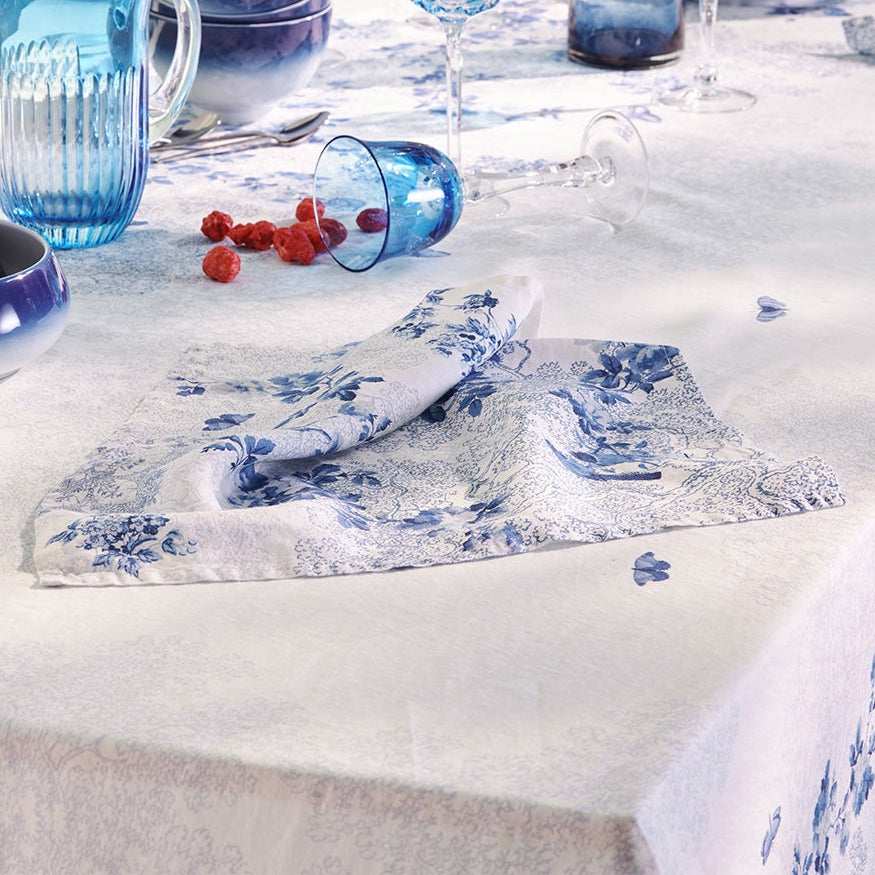 Inspired by fine china, blue and white butterflies and birds gracefully fly over to delight with the cotton-linen blend Voliere Bleu Napkin. This printed design was crafted from original artwork, hand-drawn by our in-house team of textile artisans & designers in France. Combining the best qualities of cotton and linen, this fabric blend seamlessly enhances the table with its effortless appearance while providing durability and long-lasting performance. Add a touch of whimsy to your table with the Voliere Bleu Napkin, showcasing graceful blue and white butterflies and birds inspired by fine china on a cotton-linen blend fabric to enhance your dining experience with both style and durability.