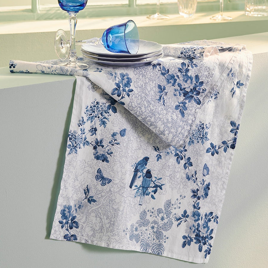 The elegance of fine, classical china inspires blue-and-white butterflies and birds in flight in this cotton-linen blend Voliere Bleu Tablerunner. This printed design was crafted from original artwork, hand-drawn by our in-house team of textile artisans & designers in France. Combining the best qualities of cotton and linen, this fabric blend seamlessly enhances the table with its effortless appearance while providing durability and long-lasting performance. Create an enchanting dining atmosphere with the Voliere Bleu Tablerunner, showcasing the timeless elegance of classical china through its graceful depiction of blue-and-white butterflies and birds.