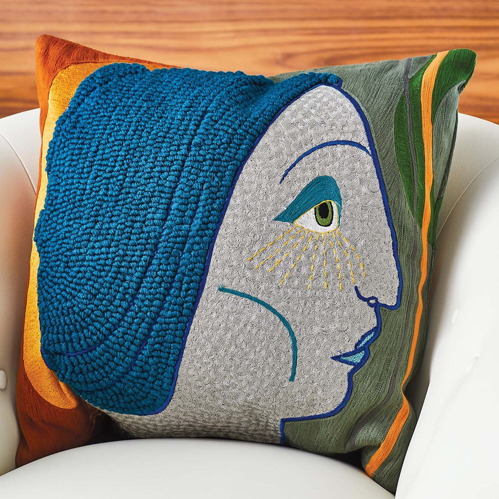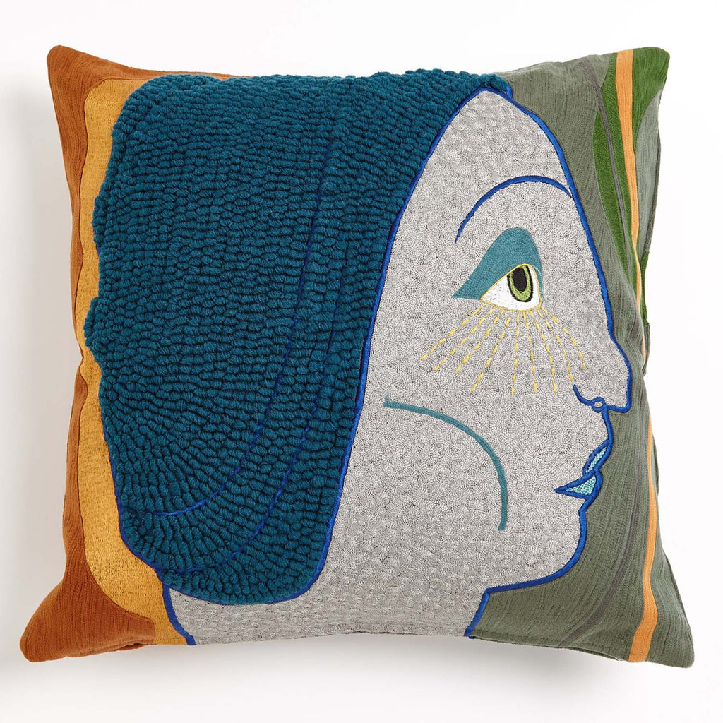 The Global Views Frau Heidi Pillow is a modern take on a classic portraiture with hand embroidered cotton details and a down fill insert.