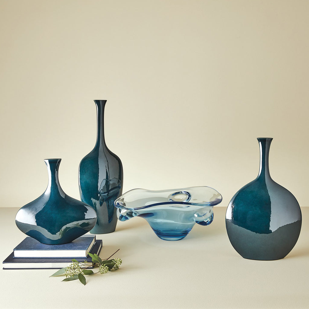 The Triple Bubble Bowl is handcrafted in a small art glass factory in southeastern Poland. Skilled artisans begin by forming the blue glass in a mold, then use a round tool to carefully push through the bowl walls, creating three distinctive bubble details. Finally, the glass is annealed for over 24 hours to ensure a gradual cooling process. Each piece is unique, so variations in shape and color may occur, making every bowl a one-of-a-kind work of art.