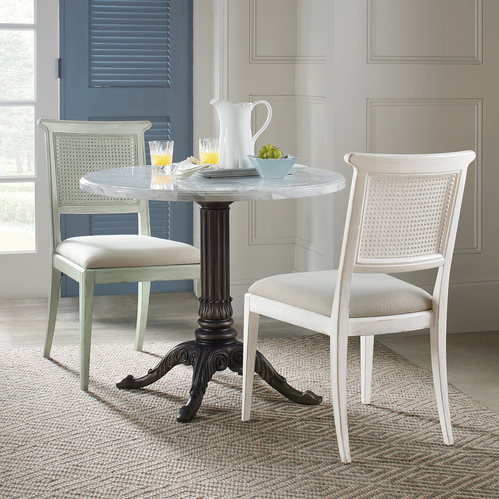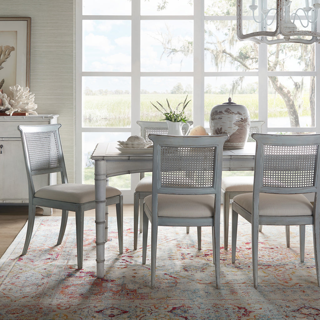 Inspired by the tropical craftsmanship of the West Indies and the woven cane accents of classic British and Dutch Colonial design, the Charleston Upholstered Seat Side Chair has an oyster-colored fabric seat and a cane back.