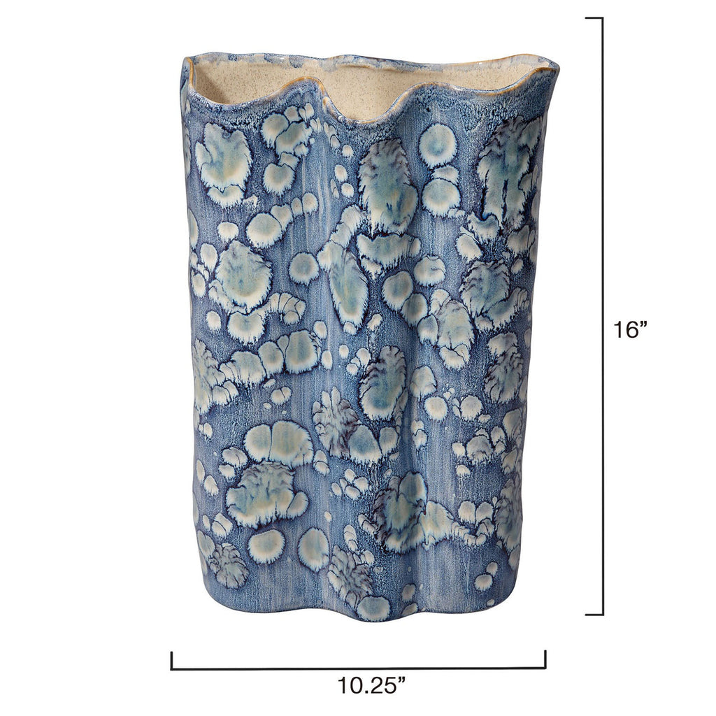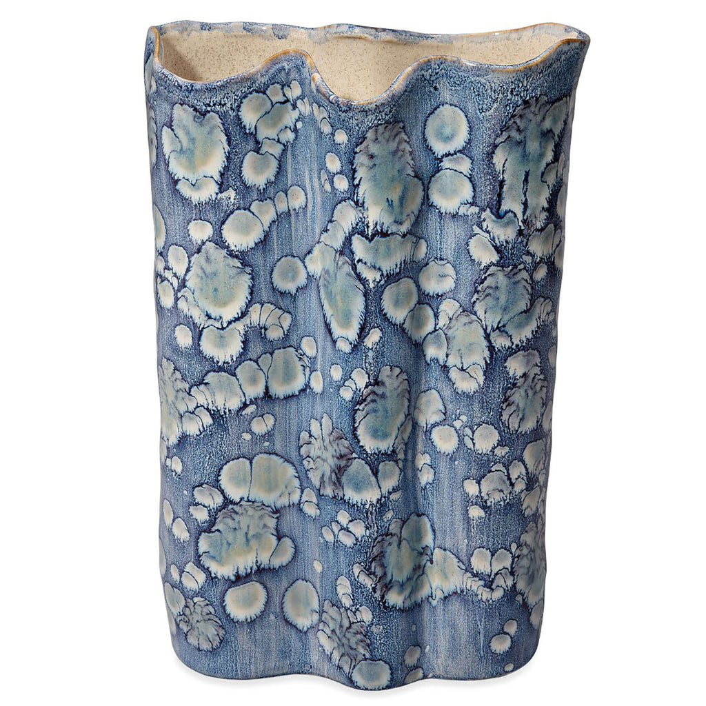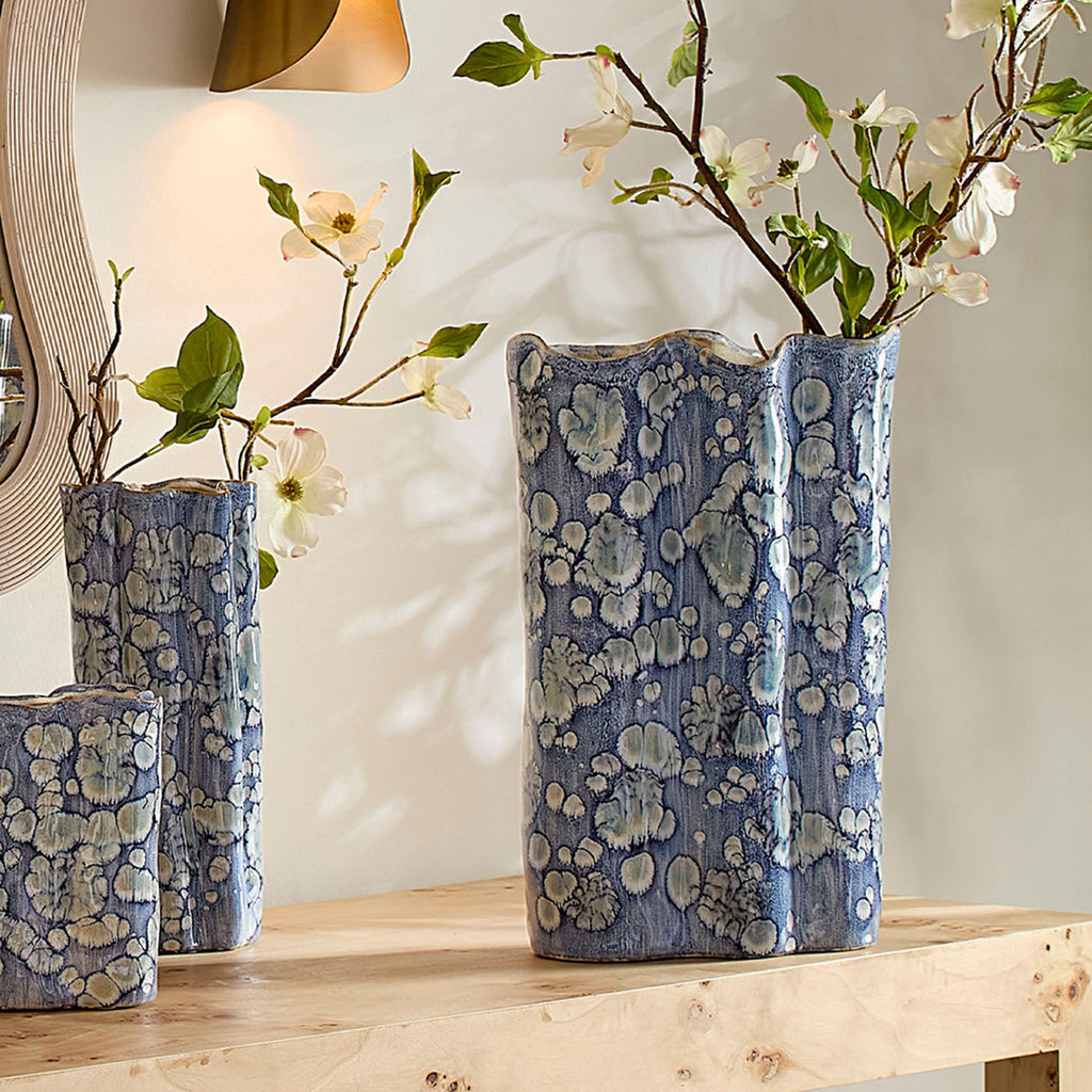 This serene ceramic vase is distinguished by its unstructured shape and a relaxed take on traditional blue and white themes. The patterns on the exterior are created using blue reactive glazes, while the interiors remain raw and unadorned. Artisan crafted and finished, each piece features unique patterns, ensuring that no two are identical. Perfect for florals, they can be filled with your favorite fresh or preserved elements!