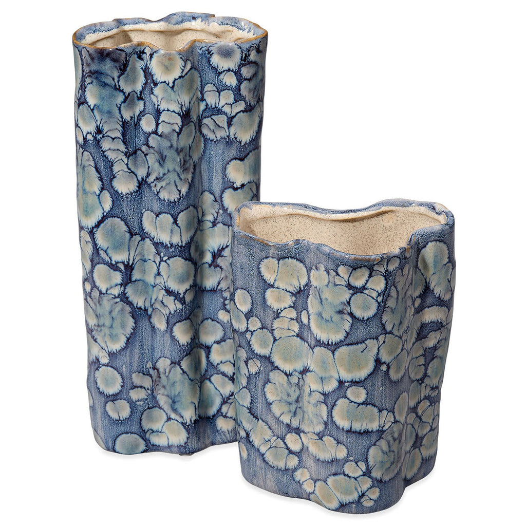 This serene set of ceramic vases is distinguished by its unstructured shapes and a relaxed take on traditional blue and white themes. The patterns on the exterior are created using blue reactive glazes, while the interiors remain raw and unadorned. Artisan crafted and finished, each piece features unique patterns, ensuring that no two are identical. Perfect for florals, they can be filled with your favorite fresh or preserved elements!