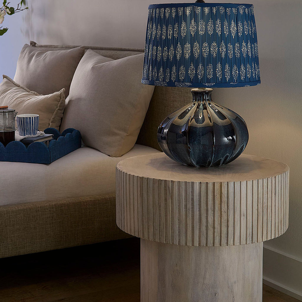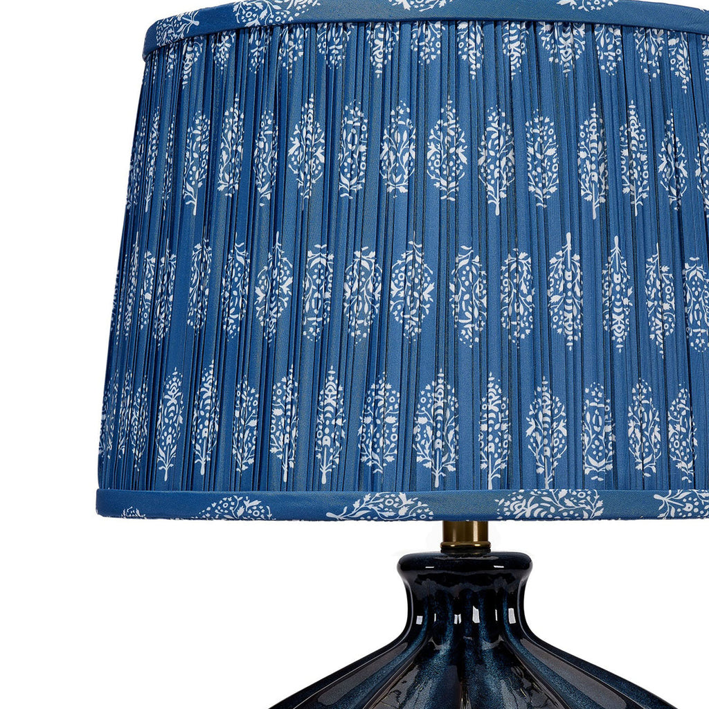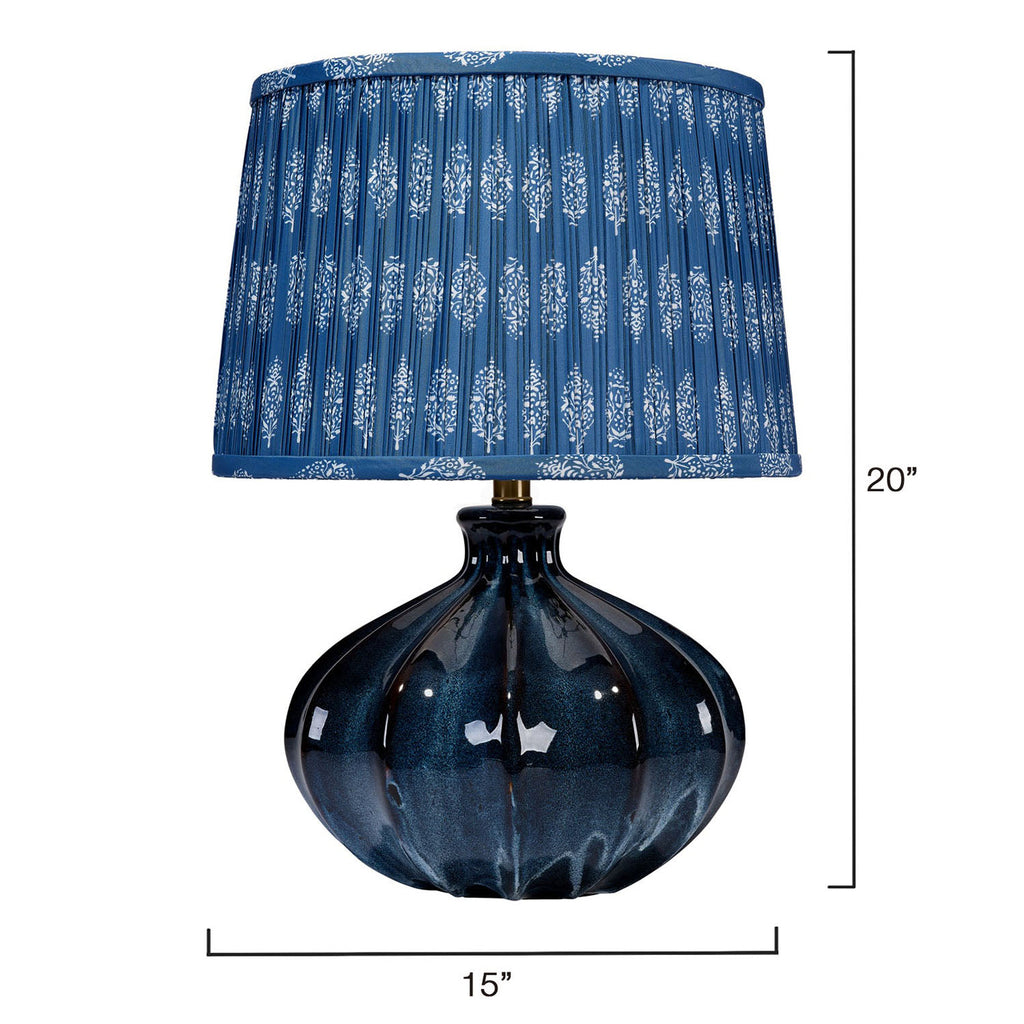 A deep blue reactive glaze creates a striking look when hand-applied to the softly curved, gourd-shaped base of this charming table lamp. The technique requires an expert hand to achieve this depth of tone and color. An open-cone cotton shade with a jaunty pattern and trimmed edges keeps the look casual, while a ceramic ball finial and gold-toned hardware preserve its elegance. We love it in the kitchen or family room.