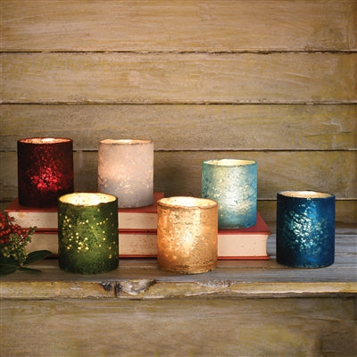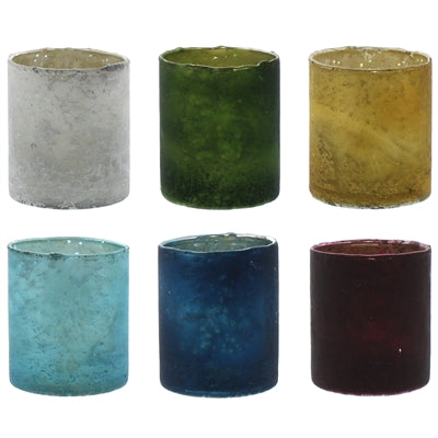 An assortment of glass votive cups offered in 6 vibrant colors. Each votive features a semi translucent exterior allowing the warm glow of candle light to shine through.