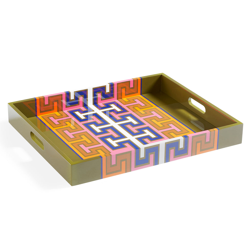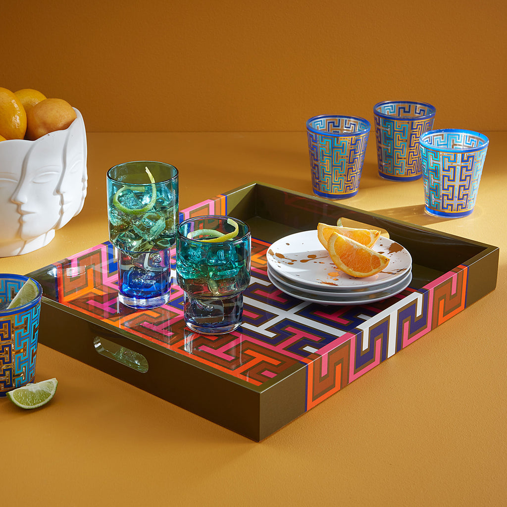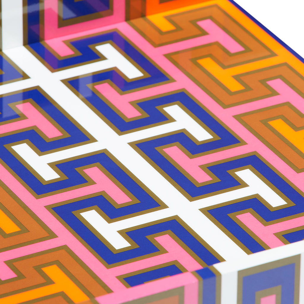 Featuring a bold pattern in vivid cool tones with a white and navy accent down the middle and a hand-finished high-gloss shine. A bold addition to any counter, console, or cocktail table, it corrals your stuff without any fuss.