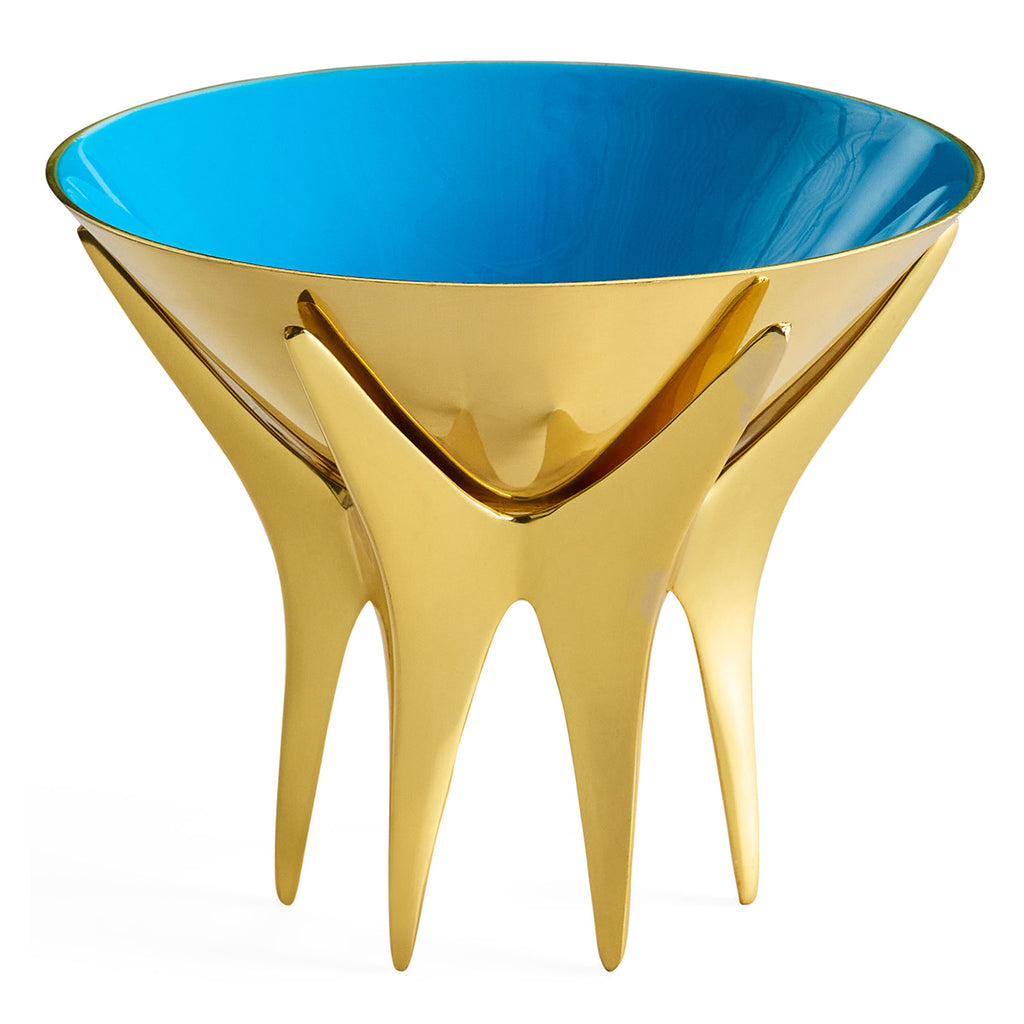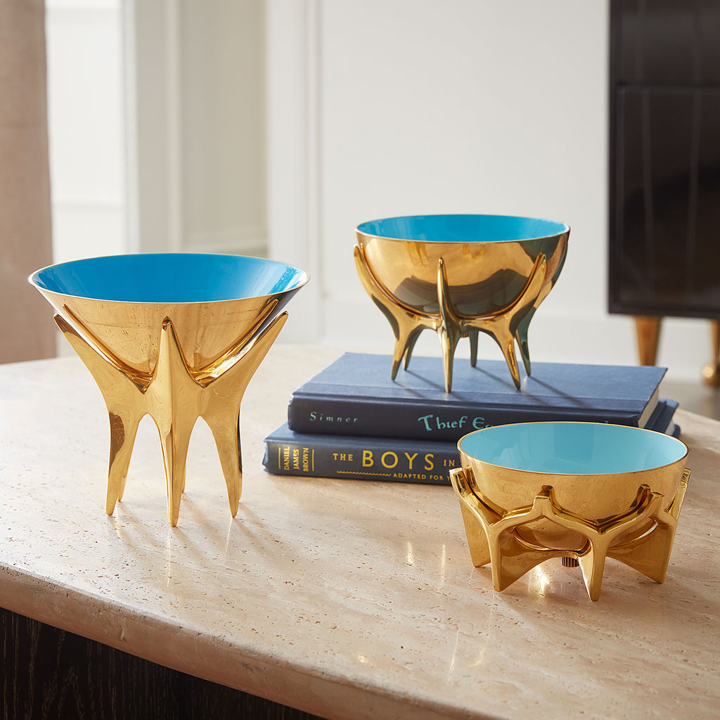 Rendered in solid brass with rich blue enameled interiors, our Oscar Bowls are inspired by midcentury architecture, but also add a pop of jewel-like color to your tablescape. A couture presence on your cocktail table or vanity, they’re are also divine for dinner parties. Group the trio together to see the whole range of marine hues. Jonathan and his team design and sculpt each prototype by hand in our Soho studio. Then, they're sand-cast in solid brass and polished to perfection by hand.