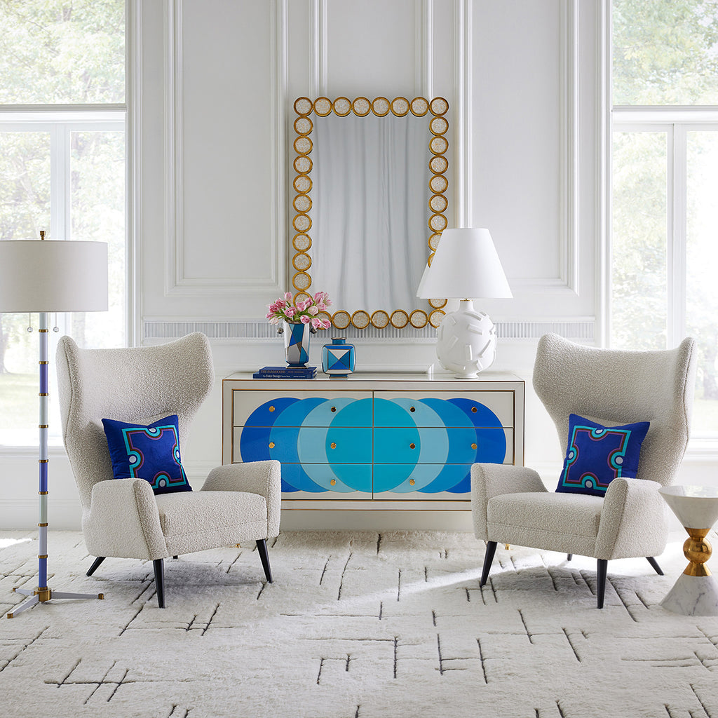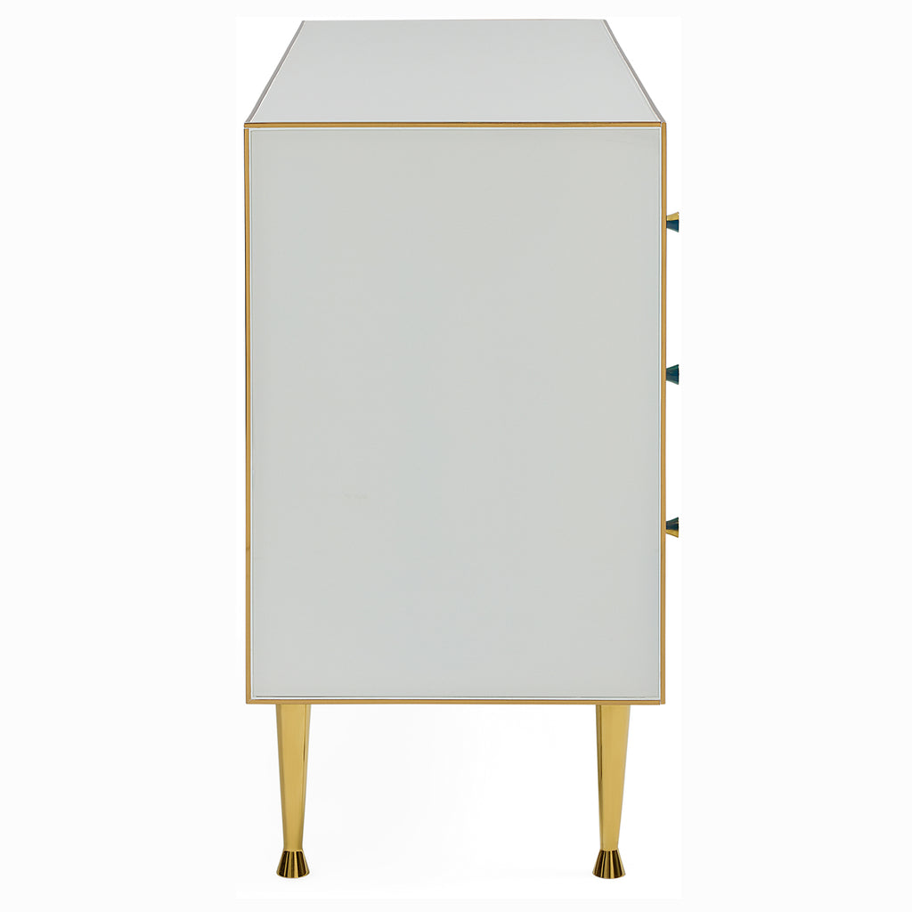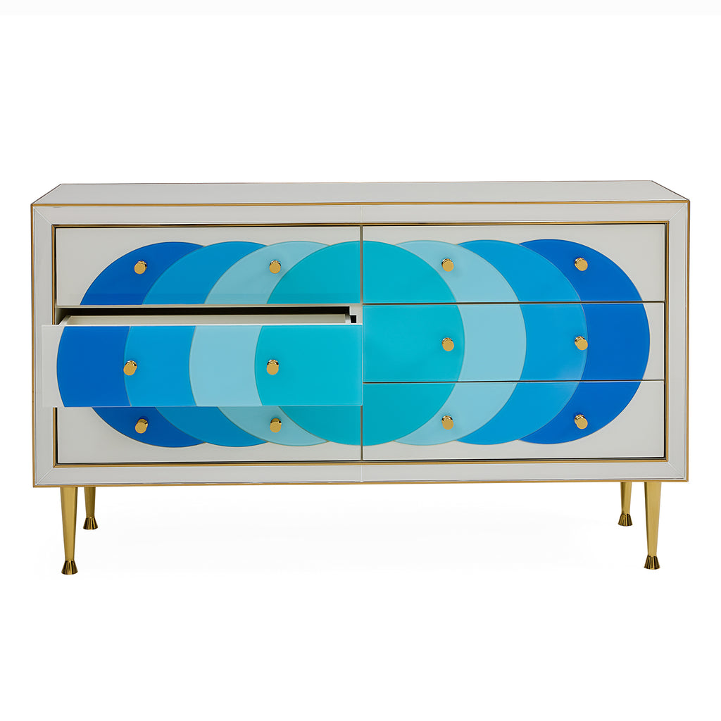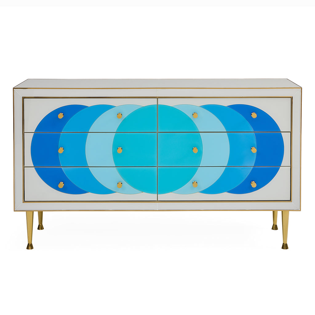 Add a splash of oceanic color anywhere from your entryway to the boudoir with our Ultramarine Credenza’s mod dot pattern. Crafted from glass panes back painted in our refreshing, Mediterranean-inspired blues and gleaming polished brass edging. Six generously sized soft-close drawers are dotted with two brass pulls each. Hits all the right notes whether in the hall, behind the sofa, or duetting with your dining table.
