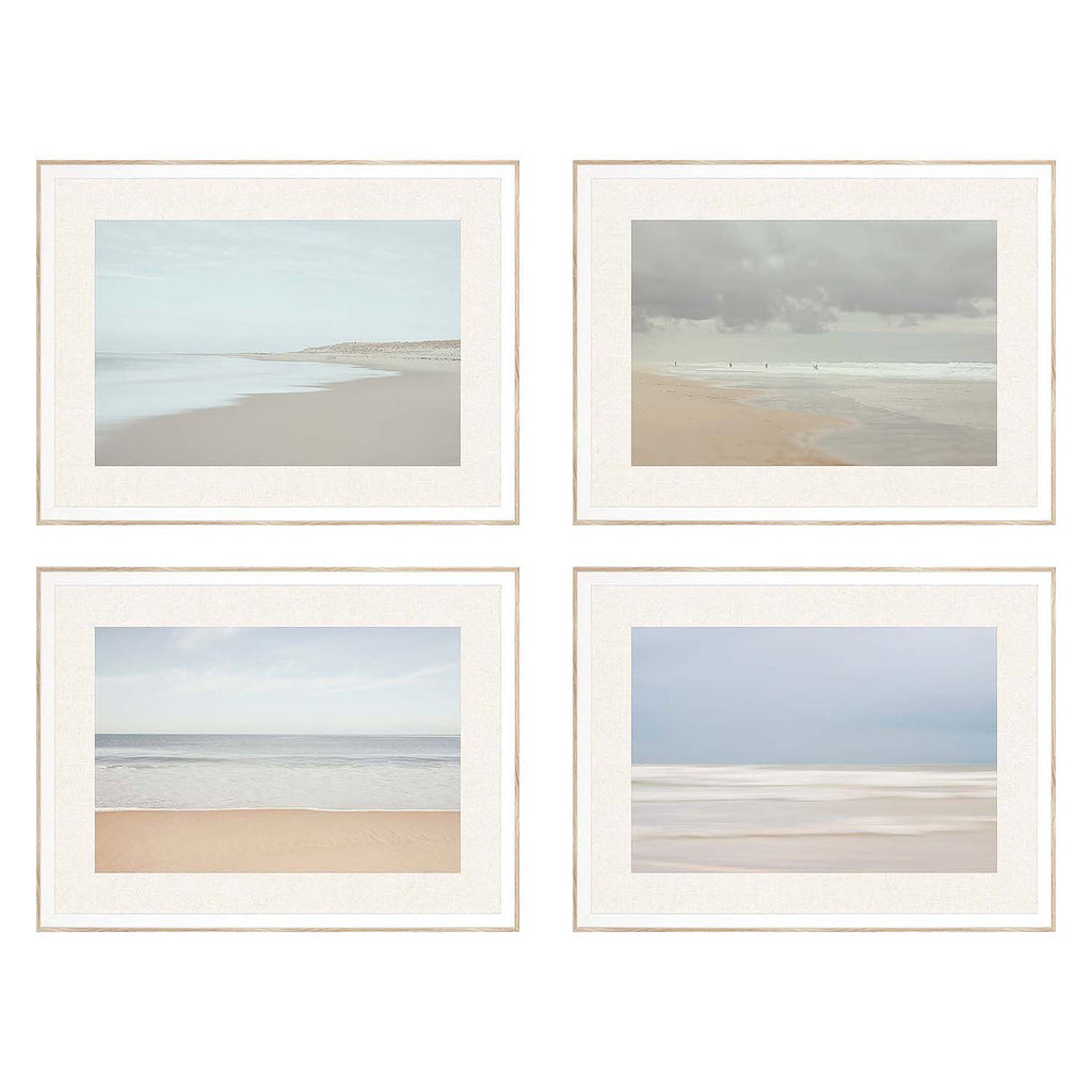 Serene seascapes feature premium matting. Framed in a ribbed white wood molding with blonde wood finish side. Sold as set of four.