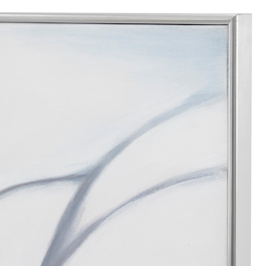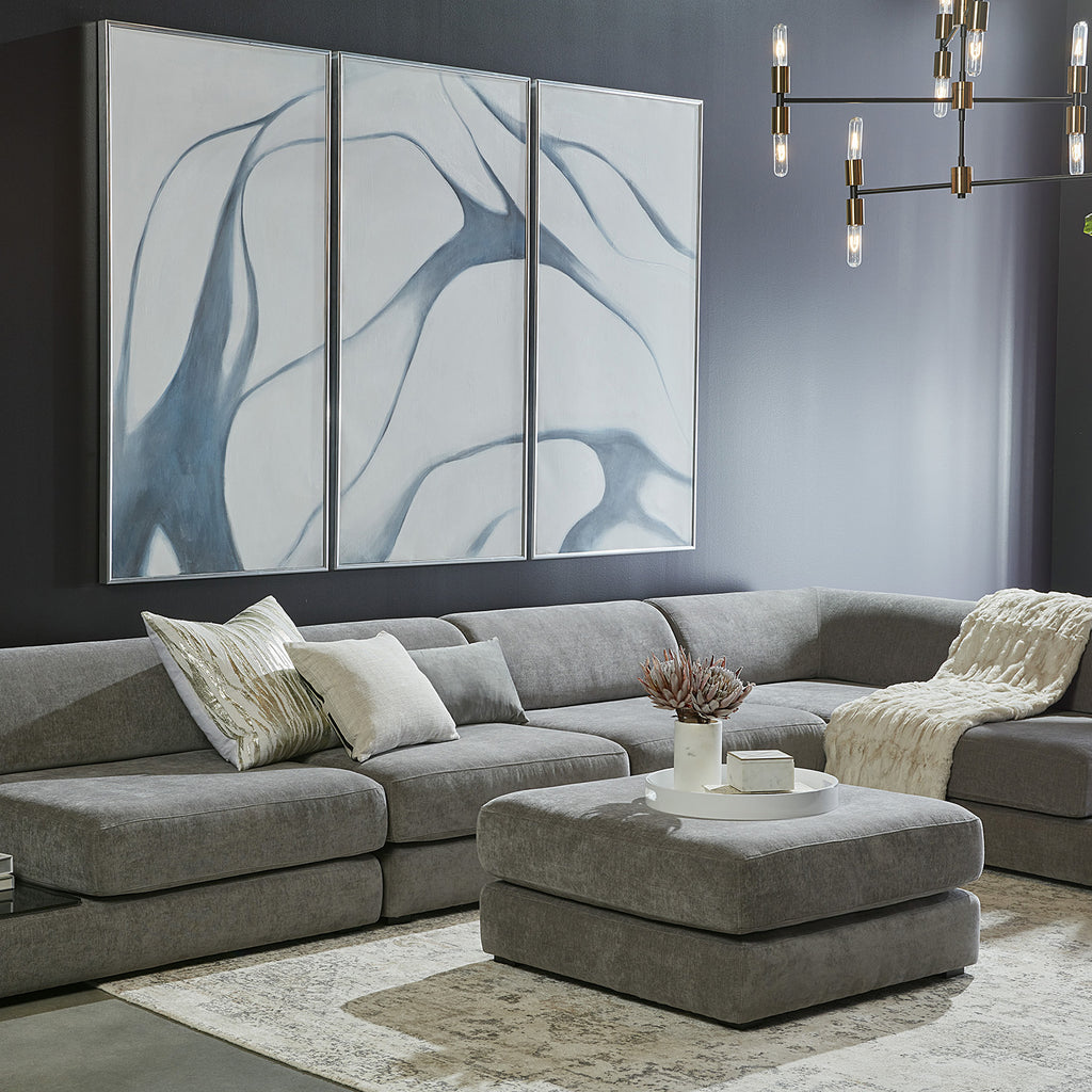 This triptych painting features a monochromatic design in cool blue hues. Flowing lines stretch across the three canvases to create a sense of tranquility and harmony. Features a silver wood floater frame.
