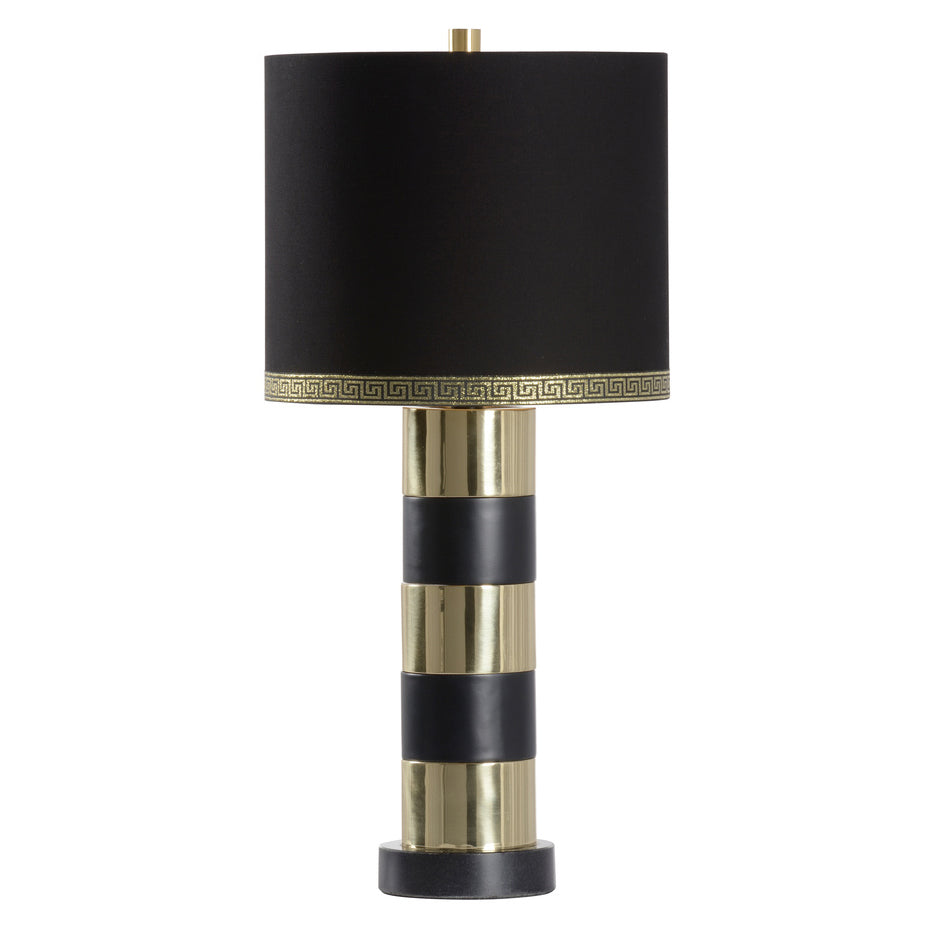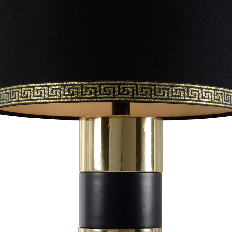 Polished brass and black metal stack up this cylindrical column creating a modern table lamp. A black drum shade with gold greek key trim adds cohesiveness and visual interest to the design.
