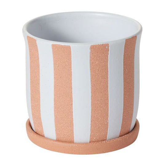 A bit of natural color goes a long way with the warm, unfinished terracotta & white glazed pattern of the large, curved Andreas Pot. Featuring surface texture on the terracotta stripes & saucer, this unique piece offers appealing hues that complement any decor, whether in a den, kitchen, or bedroom. Add a drop-in plant, & the drainage hole allows for easy watering.