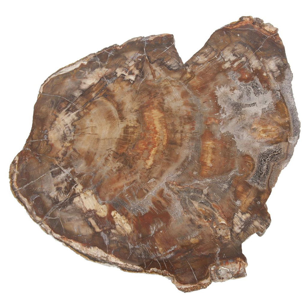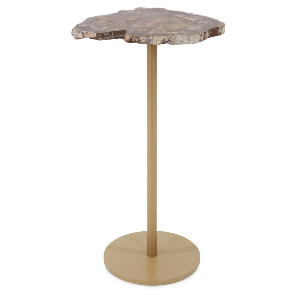 The beauty of petrified wood with all it's depth of pattern and colors come to life in this small functional table. The natural wood tones are highlighted on a gold finished iron base. This table is an eye catcher and conversational piece in any room from formal to casual.