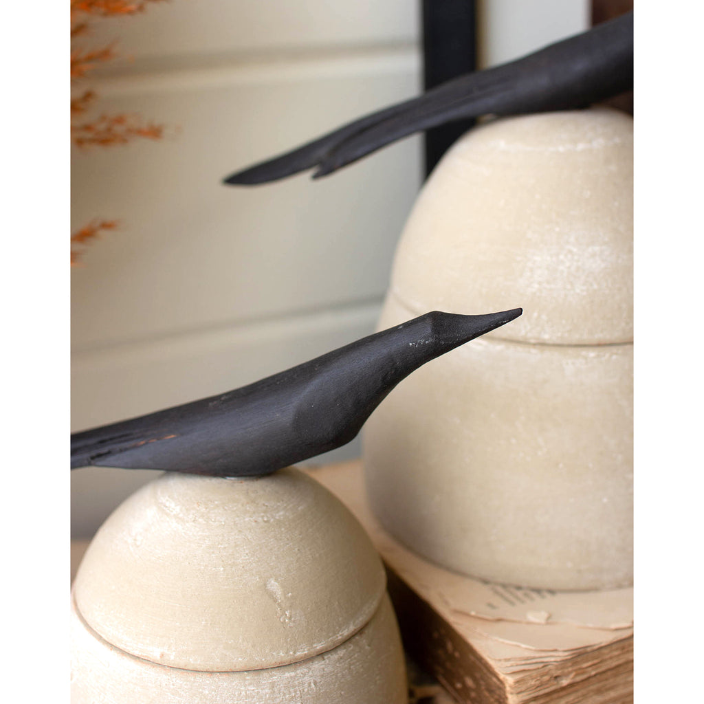 These blackbird-topped canisters suit any kitchen or living space. You can pull them out for spooky season or add them to your year-round collection. The canisters consist of Honduras clay with wooden bird handles.