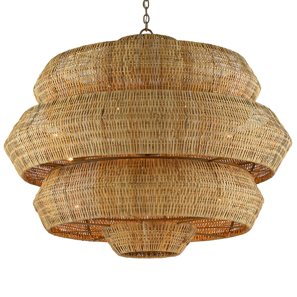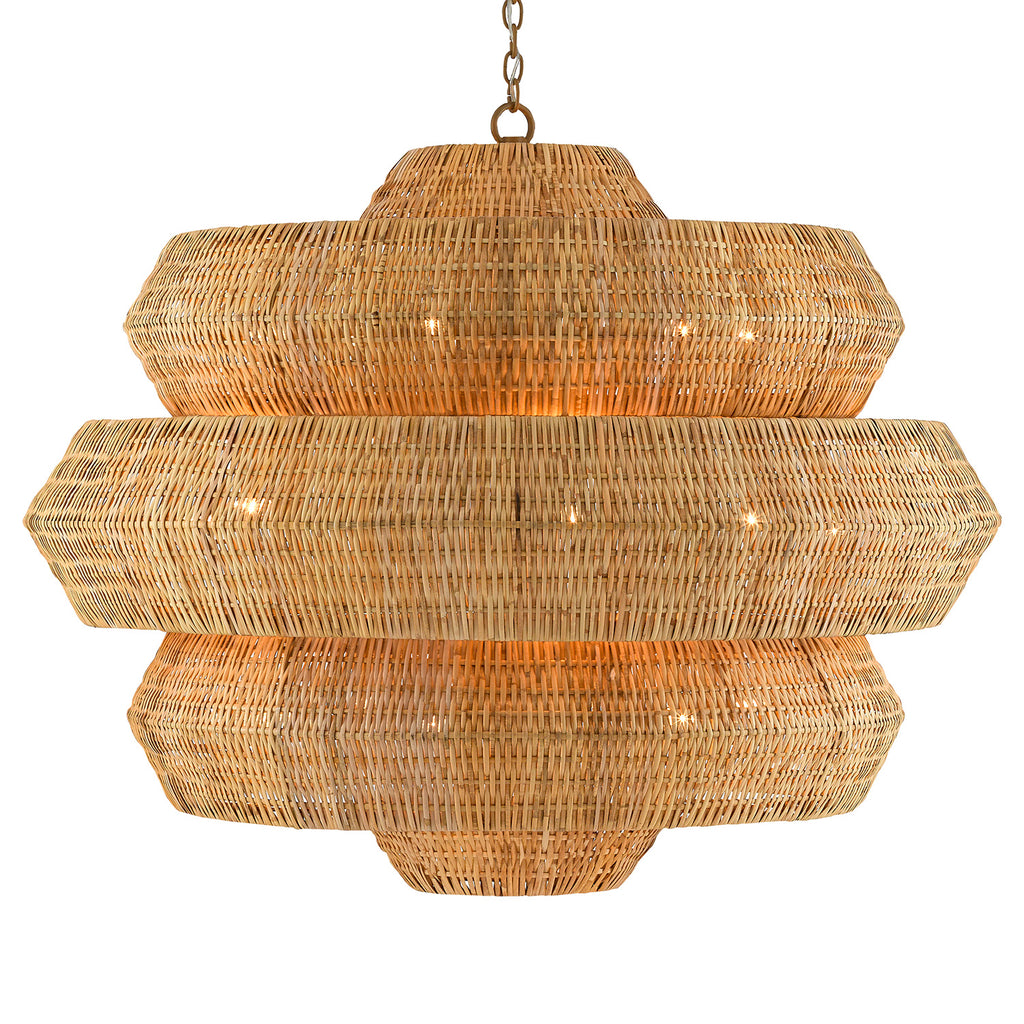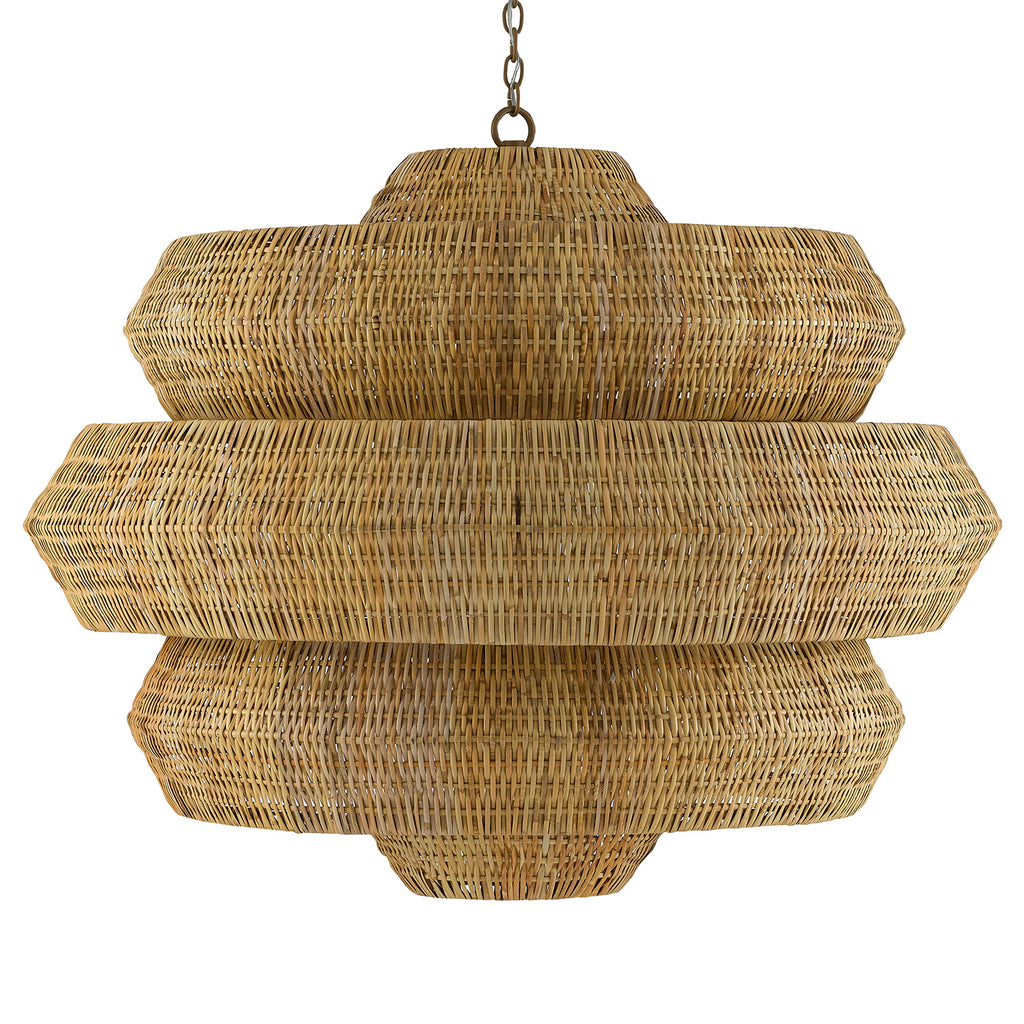 Painstakingly woven by artisans who use traditional techniques, the Currey and Company Antibes Grande Chandelier is an impeccable marriage of artistry and high-quality construction. Natural rattan forms the body of this geometric chandelier, supported by a wrought iron frame that has been treated to a khaki finish. This nine-light fixture will introduce a touch of worldly flavor and a bit of island style into contemporary, transitional or traditional interiors.