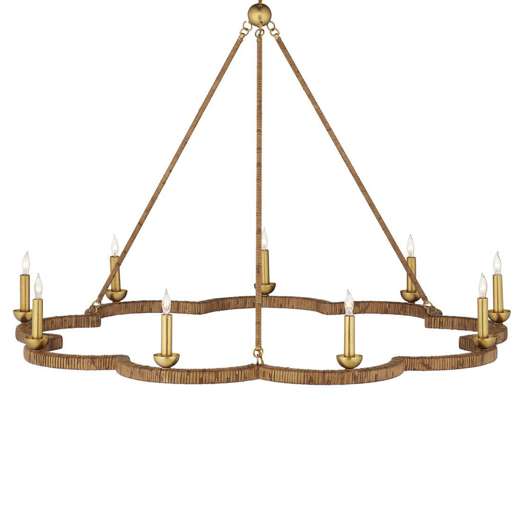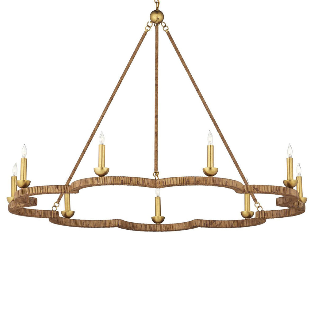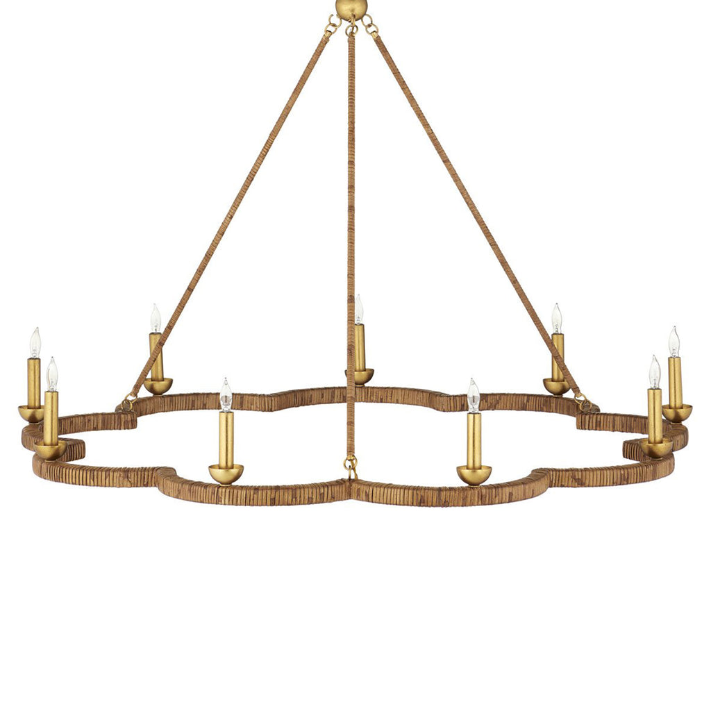 The Currey & Co Savoie Chandelier by Suzanne Duin has the French charm for which her designs are known. The scalloped frame and rods that connect it to the pretty floral-shaped canopy are covered in rattan. Where it is not wrapped in this natural material, it is finished in a contemporary gold leaf finish that brings added warmth to the overall composition. This lovely rope-wrapped chandelier brings a glow and introduces the allure for which the South of France is renowned.