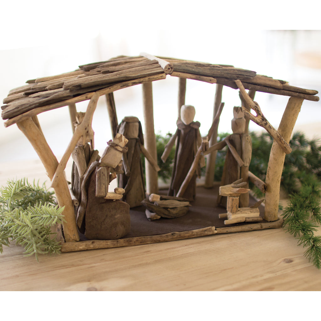 This driftwood nativity puts a rustic twist on the traditional look. This piece features driftwood forms which provides a charming folk art aesthetic.