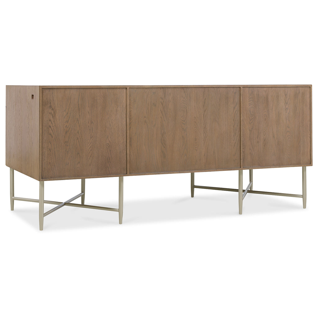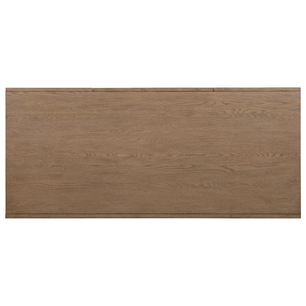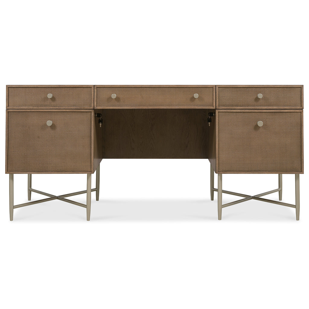 Mixing Quartered, Cathedral-Cut Oak in an earthen-toned finish with cane-front drawers and a metal base, stretchers and tapered legs, the Sonnet Executive Desk blends natural textures with a refined minimalist silhouette. The five drawers have cane-inset fronts, and there’s a removable/interchangeable writing surface and pencil tray that can be used in either the right or left top drawer. Each of the top side drawers has two removable partitions. The center drawer has a drop-front writing surface and wire management. Two locking file drawers have a Pendaflex letter/legal filing system.