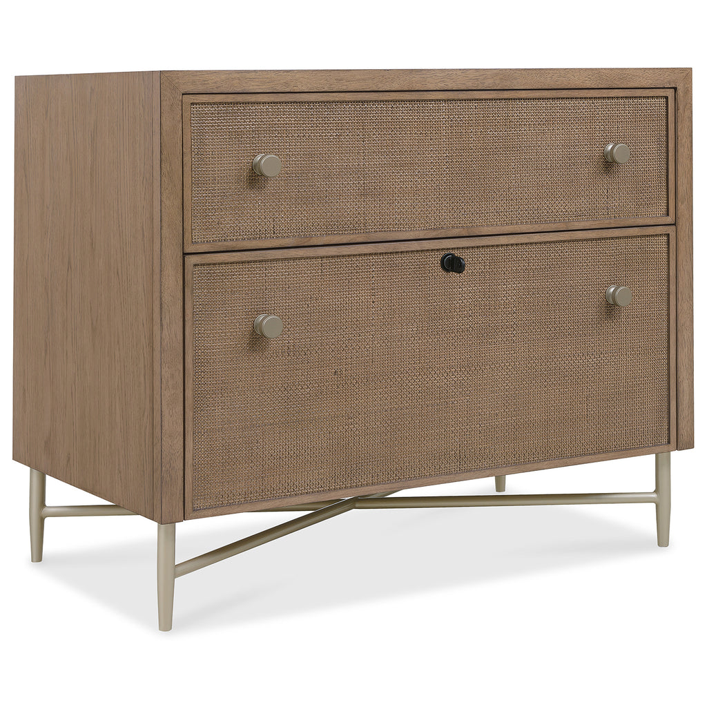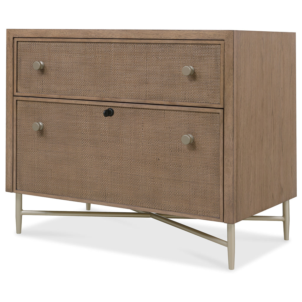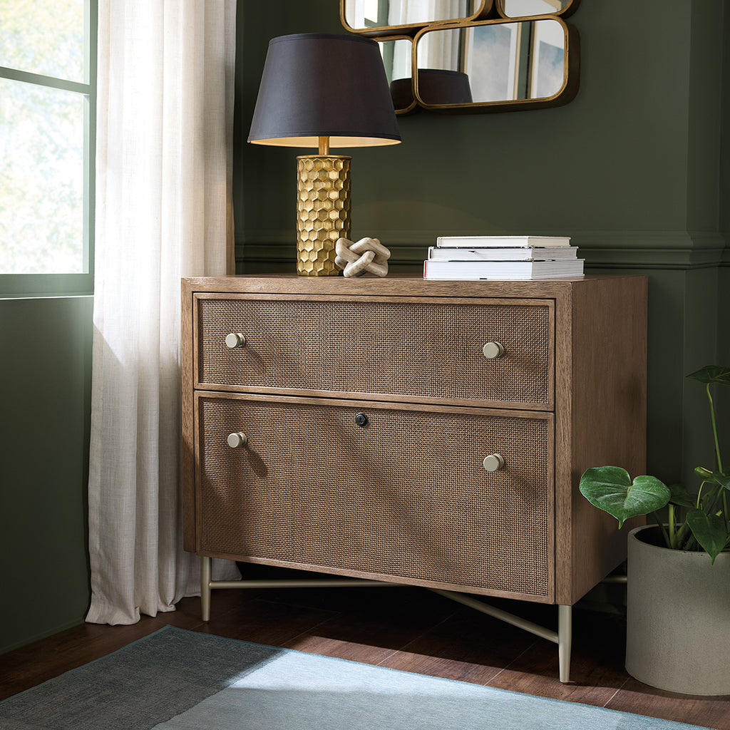 The Sonnet Lateral File offers a stylistically versatile, functional piece that blends natural textures with a refined minimalist silhouette. Crafted of Quartered and Cathedral-Cut White Oak Veneers in a light earthen finish with complementary woven cane drawer fronts, the file has tapered metal legs and stretchers and satin-finished champagne-colored knobs. The top drawer is a utility drawer and the bottom drawer is a locking file drawer with letter/legal filing option.
