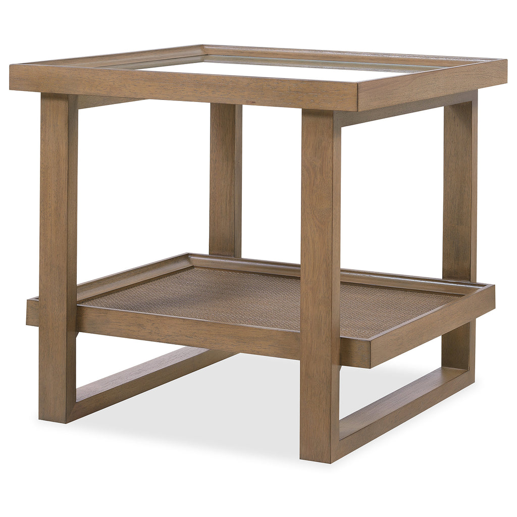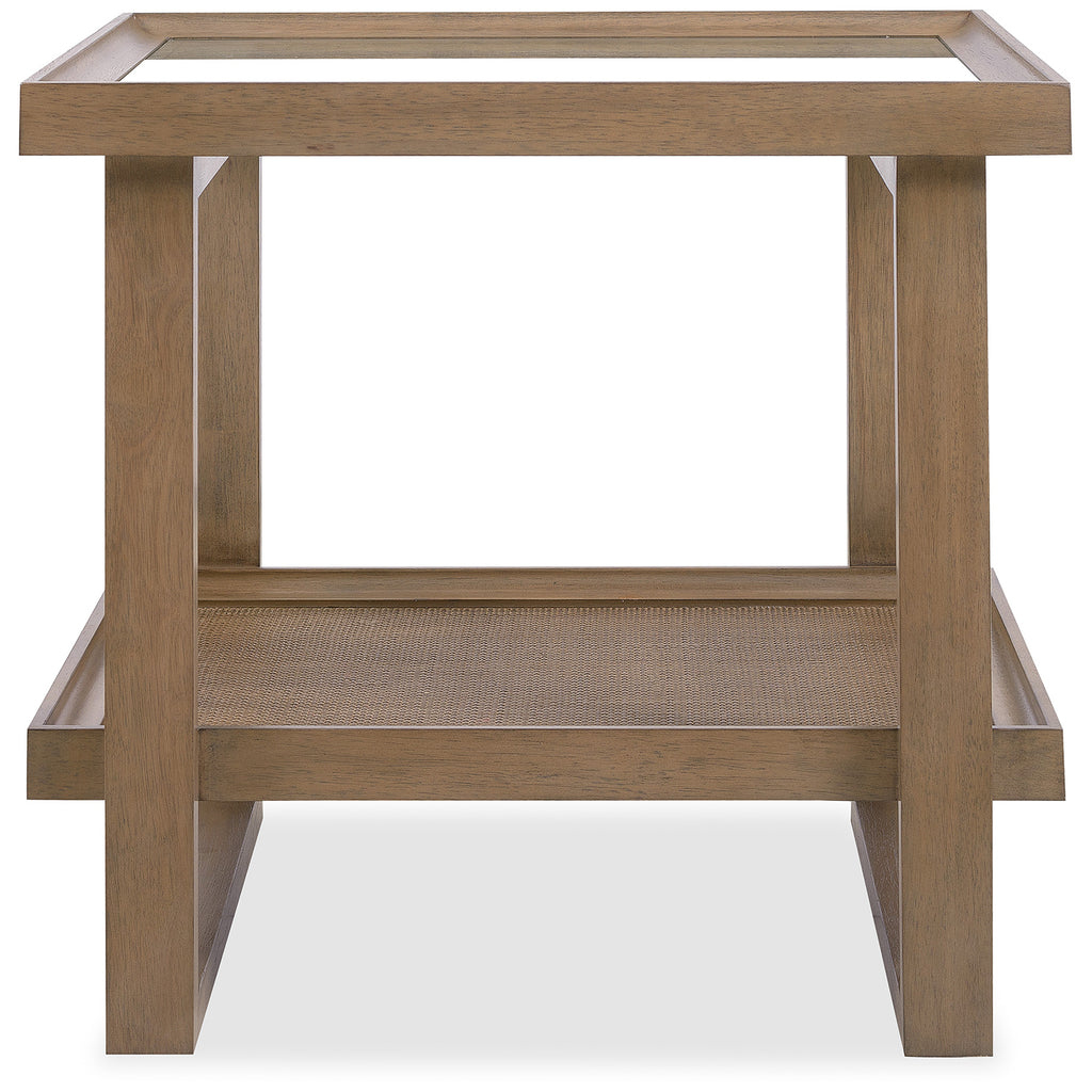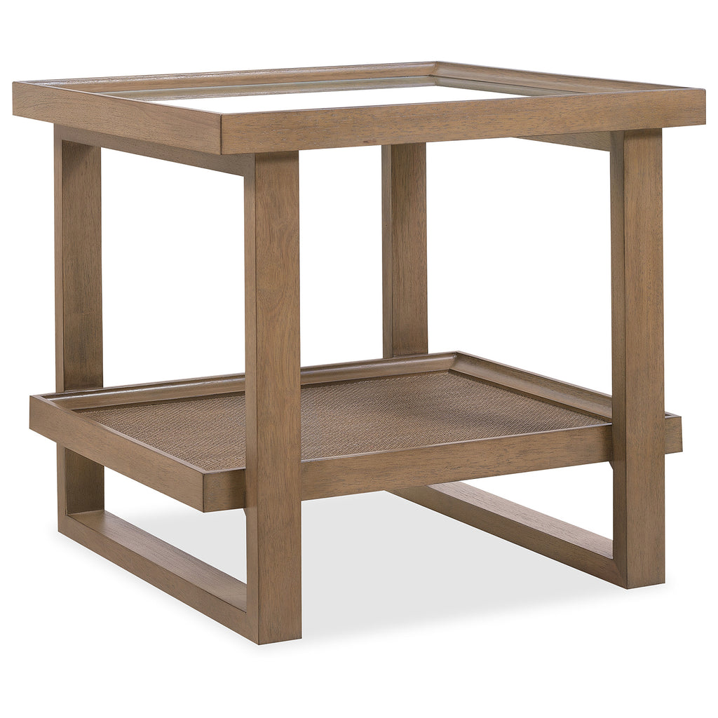 Blending organic textures and neutral tones with a refined minimalist silhouette, the stylistically versatile Sonnet End Table exudes a natural luxury. The transparent tempered glass insert top reveals the lower fixed shelf with cane insert. The frame of the table is Quartered and Cathedral-Cut White Oak Veneers in a light earthen-toned finish. 26 inches square.