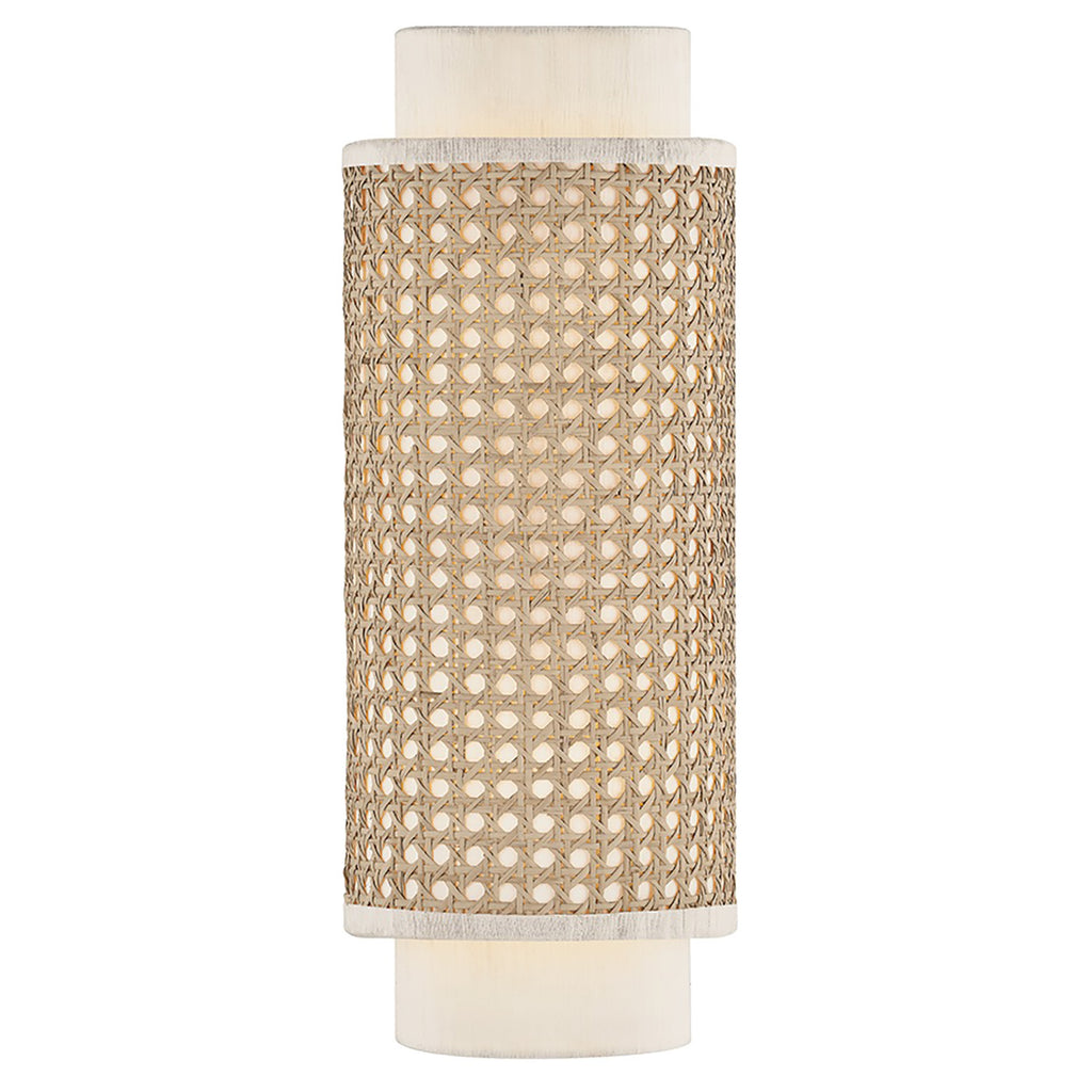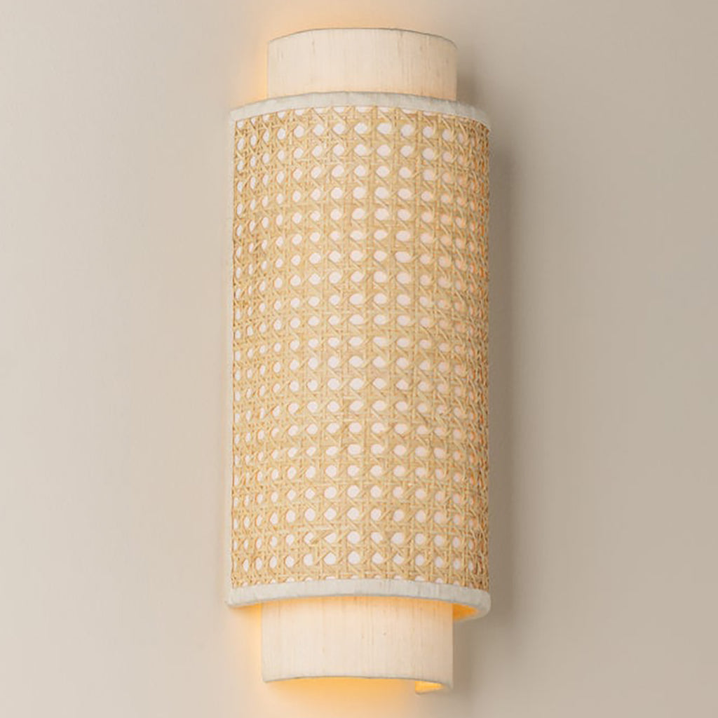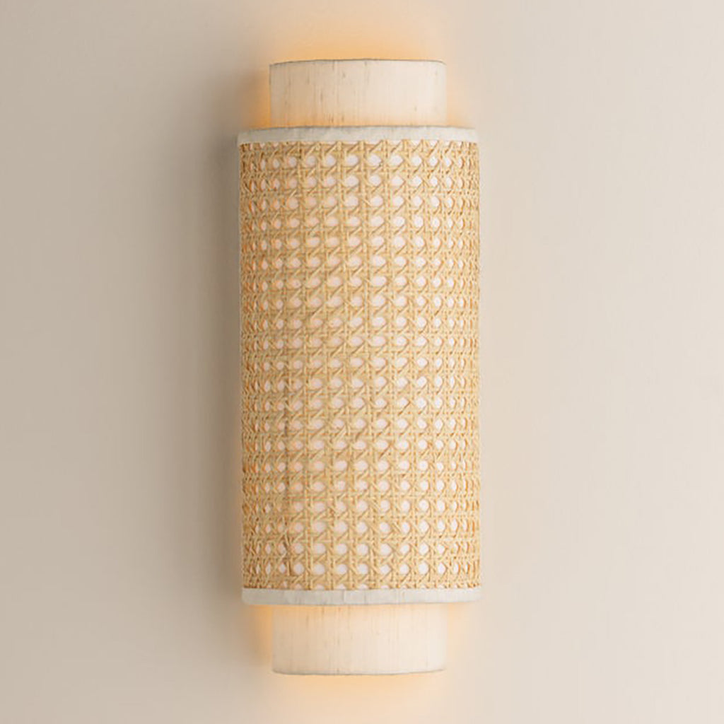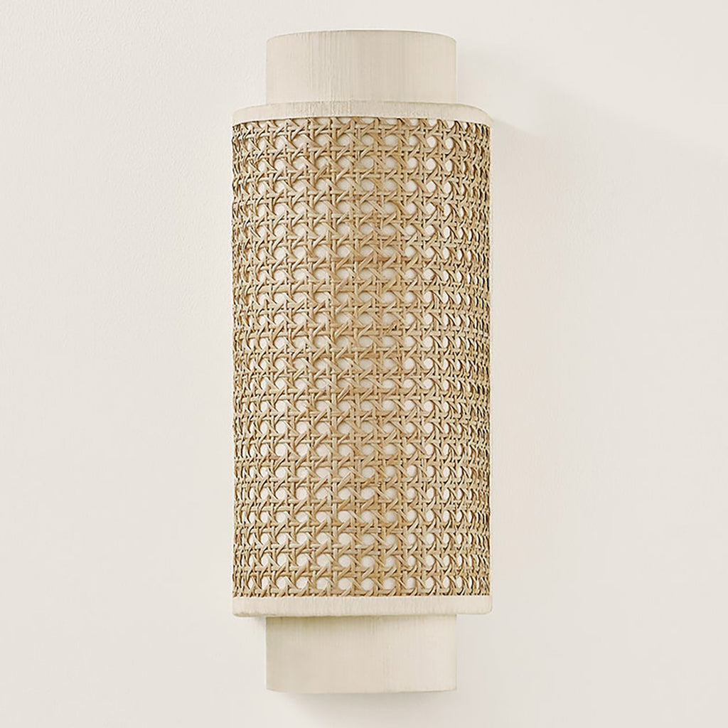 Natural materials, handcrafted detail, and soft layering create the charming and usable Mitzi Tina sconce. A curved raw silk shade forms a tunnel that shields the light, while the outer basket cane wicker layer creates a textural point of interest. A warm, inviting glow fills the shade, bouncing off concealed Aged Brass hardware and softly spilling from both ends to wash the wall.