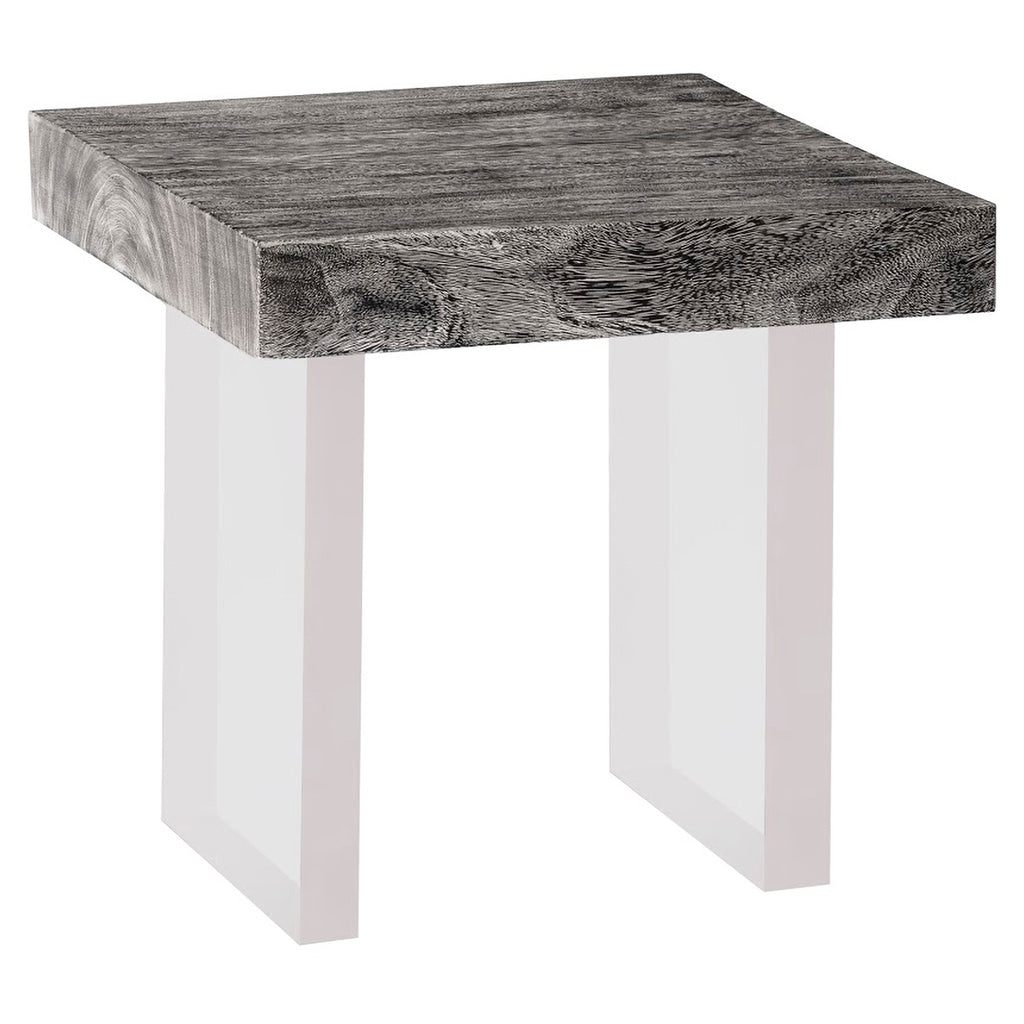 With acrylic legs that all but disappear, the plank top of the Floating Side Table seems to levitate. Made of chamcha wood covered in a gray stone finish, the top has tremendous personality given the finish adheres to the rises and falls in the woodgrain it covers in textural complexity.