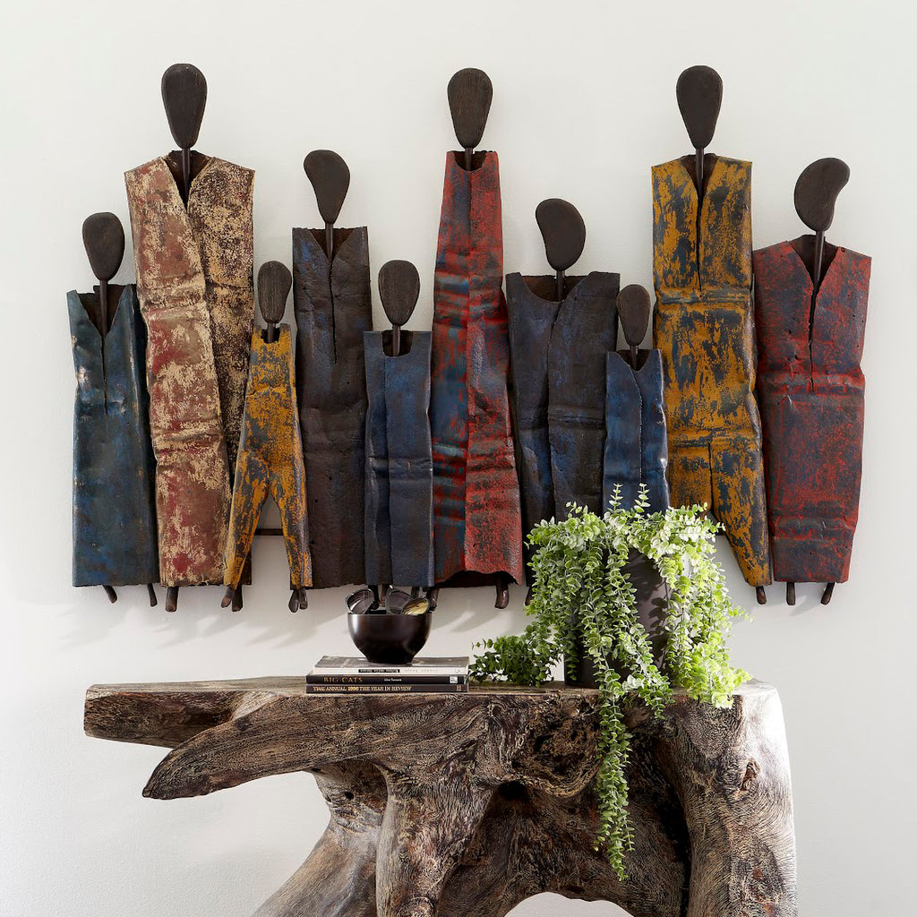 Just as its name implies, the Honey Drum People Wall Art is made from honey drums. It tells the sweet story of the people who collect honey in Northern Thailand and represents an interpretation of the clothing they wear. The drums they use to harvest honey can only be used a handful of times before they oxidize. In repurposing the metal, they are able to bring in an additional source of income that diversifies them beyond relying on the bees to produce the honey.