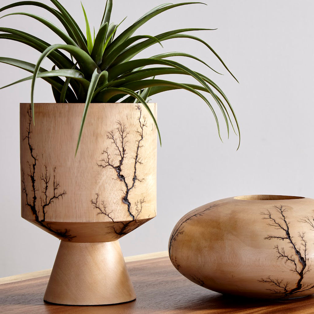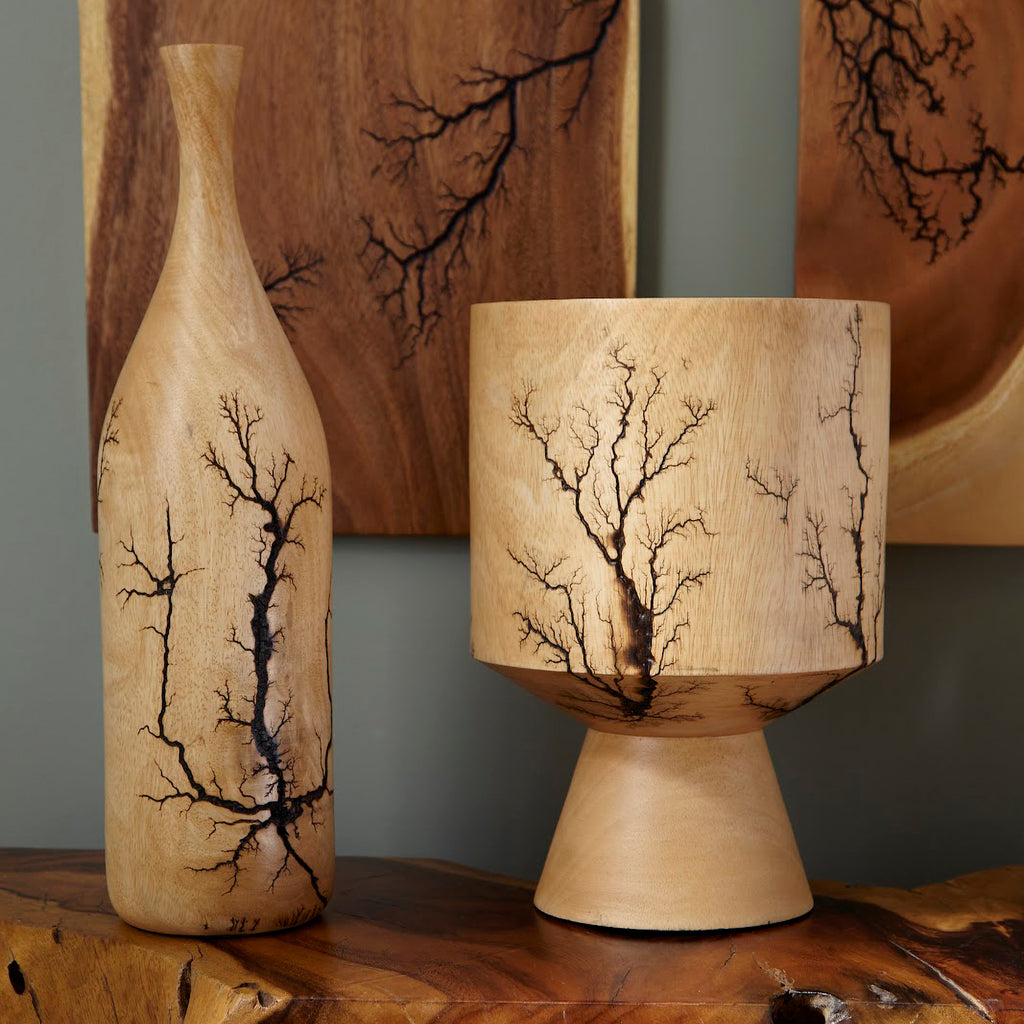 The beautiful fractal pattern was created when our skilled artisans positioned a liquid material on the wood and placed two electrodes at each end. The patterns that emerged pay homage to the tree’s DNA. The lightning patterns that run along the surfaces of these decorative wood vessels will bring powerful organic texture to a space. Place one as the centerpiece of a tabletop tableau in a modern living room or slide it into a shelf in a transitional den and you’ll see just how versatile this round decorative accent can be.