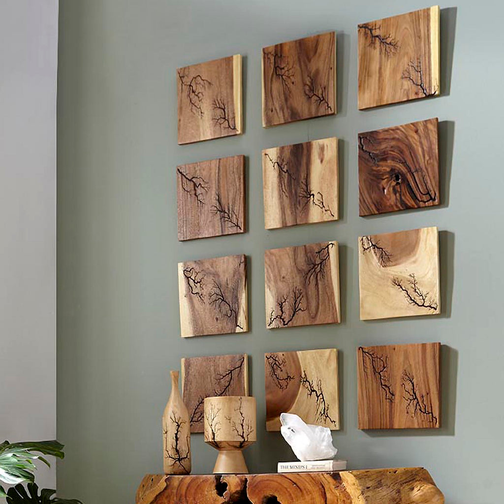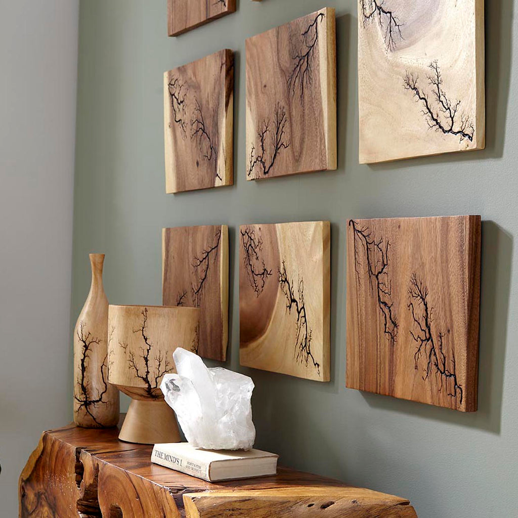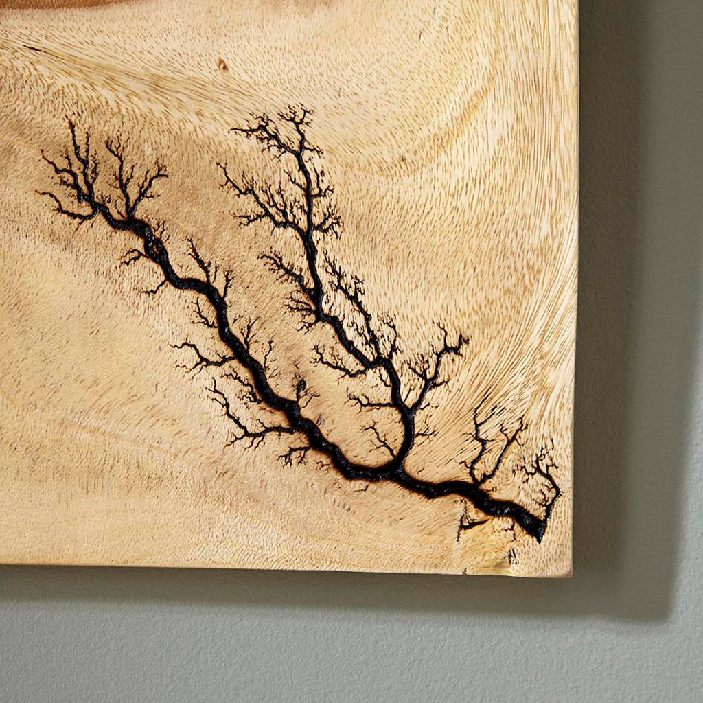 Though it is widely known that lightning never strikes twice, it has sizzled several times to create the Lightning Wall Tile. Made of chamcha wood, the tile has markings that are created when an electrode is applied to its surface and the fire follows natural markings in the tree's DNA. Each of these pieces of art are unique because every specimen of wood has its own veining that invites the fire to follow it along.