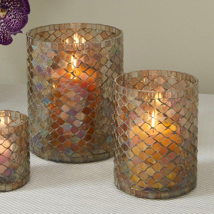 Upscale & unique with a chic, shimmery finish, the medium, mosaic-tiled glass Sabina Votive pairs well with just about any color palette & adds a luminescent shine to tablescapes. This on-trend wedding & event vessel is made with tiles applied to grout on the outside of the glass cylinder to create an iridescent finish. It can be also be used as a glass flower vase with a small bouquet. Layer with the other Sabina sizes for a coordinated display.