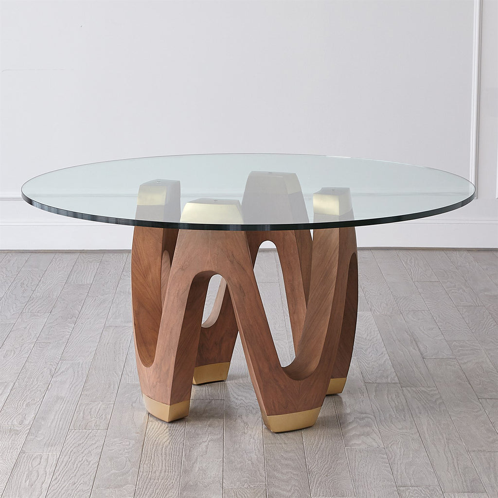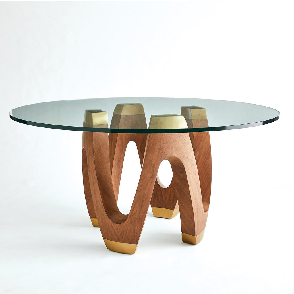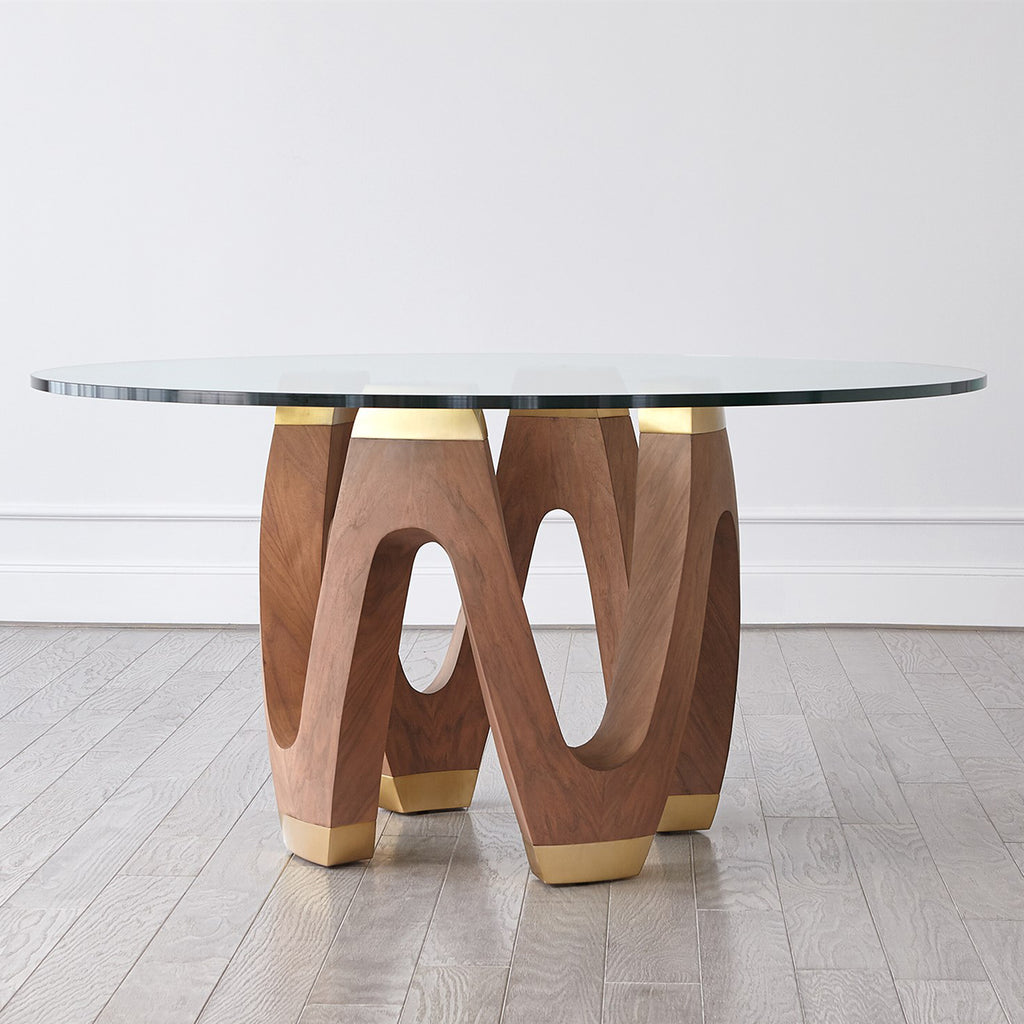 With an undulating design, the Wave Dining Table is made out of natural walnut and poplar wood with brushed brass accents and tempered glass top.