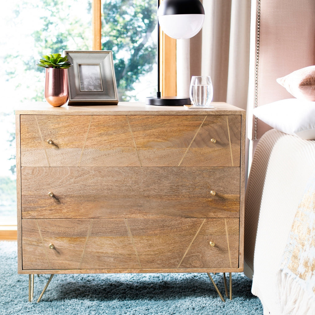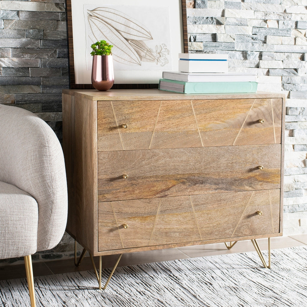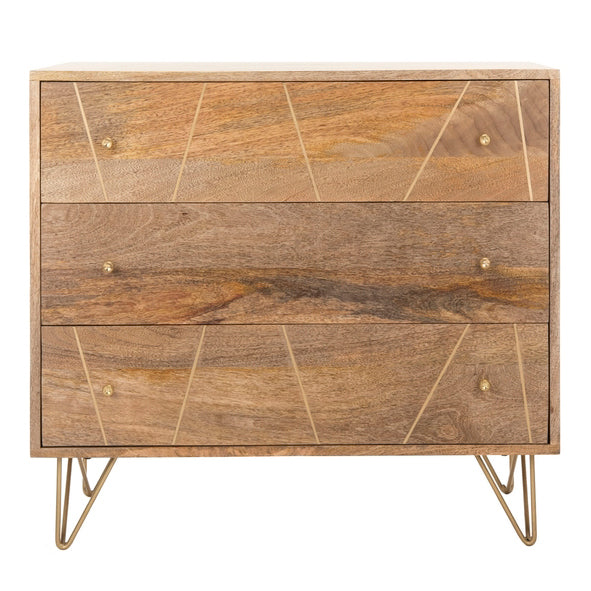 An updated spin on a treasured classic, this contemporary Trigg 3-drawer chest brings modern style to any living room. Crafted with solid wood in a natural finish, it features a chic brass graphic design on its drawers that matches its brass retro hairpin legs.