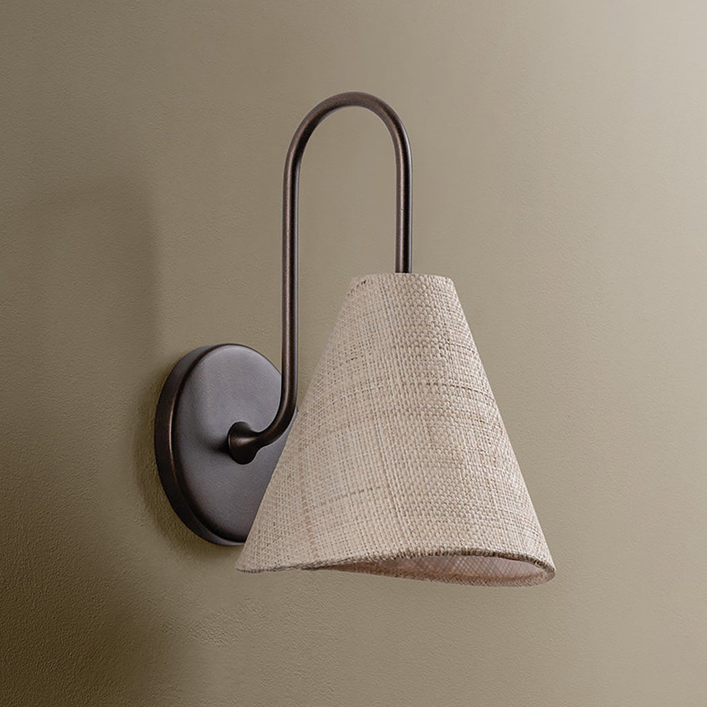 Playful and organic, the Troy Lighting Candler sconce pairs a woven shade with swooping metalwork. The undulating edge of the shade is reflected in the direction of the Saguran weave, drawing the eye upwards to the tapered top. From there, a gooseneck arm continues the curvature before it loops back down to connect at the backplate. The Bronze Leaf finish pairs beautifully with the textile’s warmth, elevating a more casual sconce to a characterful piece.