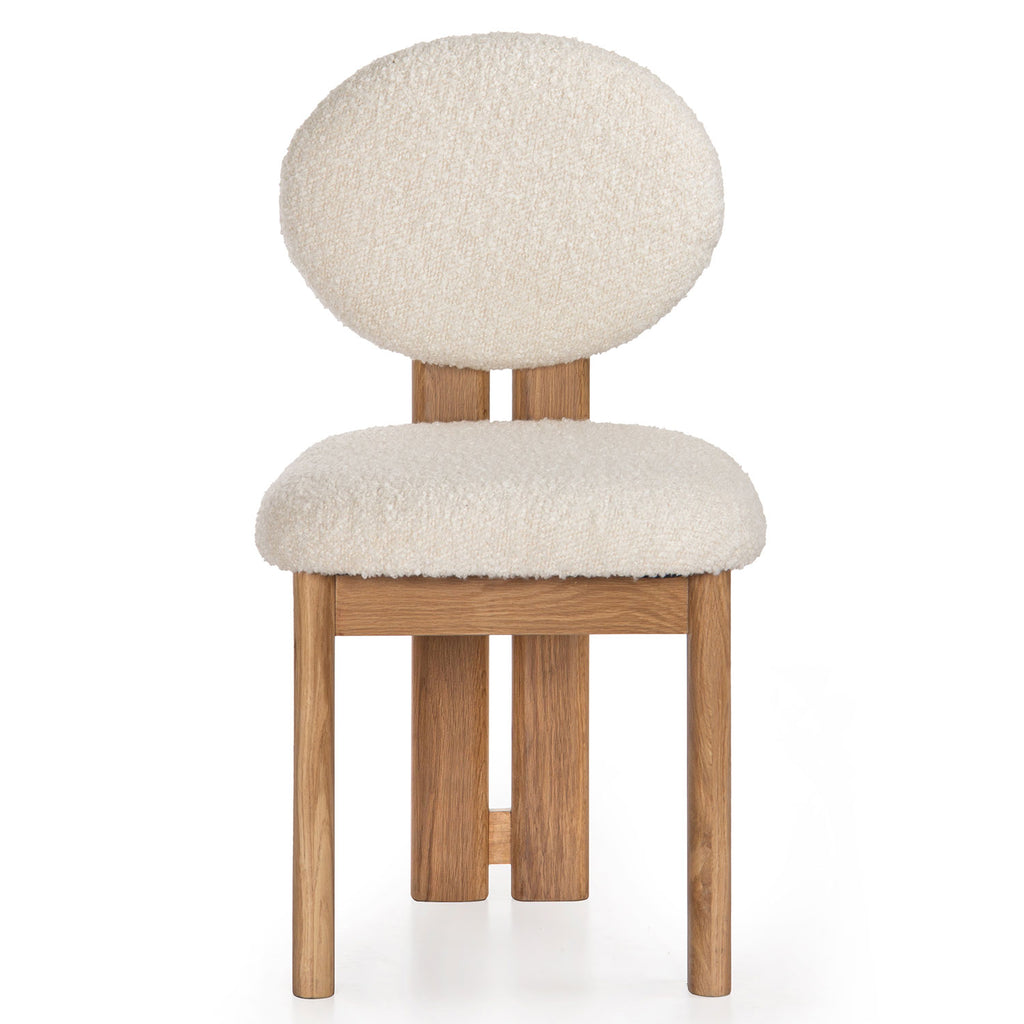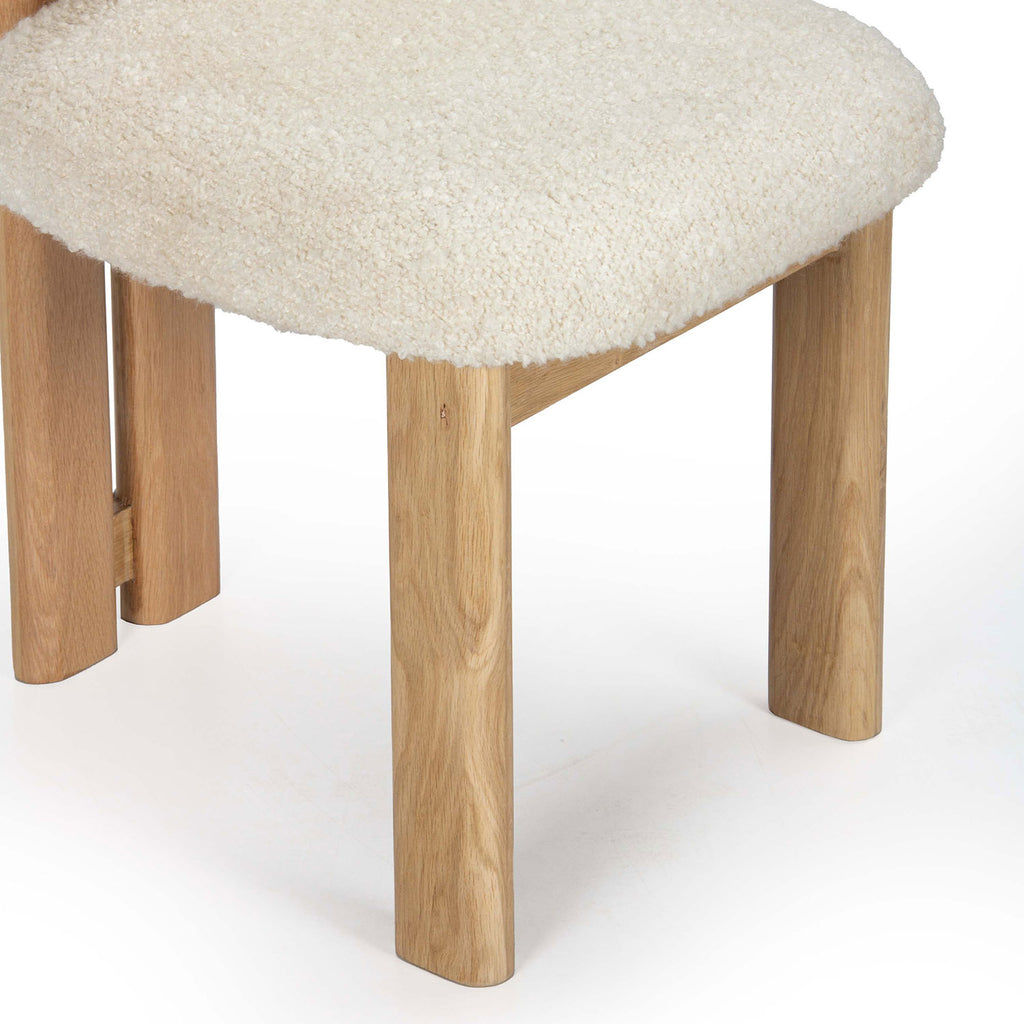 The Union Home Colton dining chair is at once rustic and modern. FSC certified, solid oak legs are connected by elegant butterfly joints that highlight this chair's honest construction. A sculptural seat and back are upholstered in up-cycled, boucle fabric.